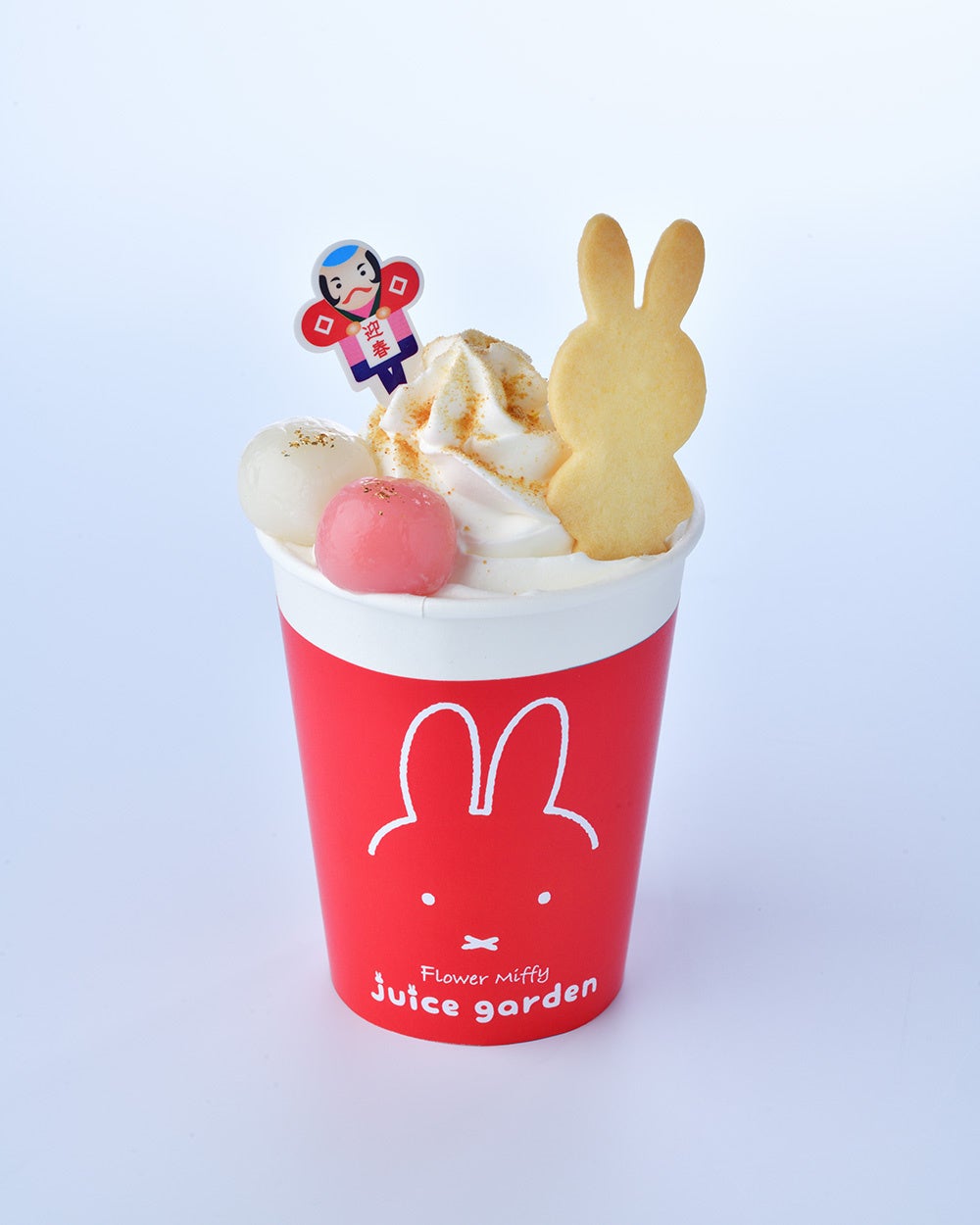 ホイップたっぷりの抹茶ラテの上に、紅白の白玉と華やかな金粉をのせ、正月凧をイメージしたピックとミッフィークッキーをトッピングした、新年のお祝いにぴったりのホットドリンクです。お正月らしい紅白カラーのフラワーミッフィー ジュースガーデンオリジナルのカップスリーブをつけて提供します。