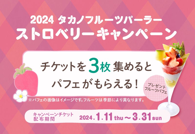 「苺のパフェ」「苺のプレートデザート」「苺のワッフル」「シーズナルトライフル 苺」「苺のショートケーキ」をおひとつご注文につき、チケットを1枚お渡しいたします。集めたチケット3枚で、次回ご来店時に「プレゼントフルーツパフェ」をプレゼント。