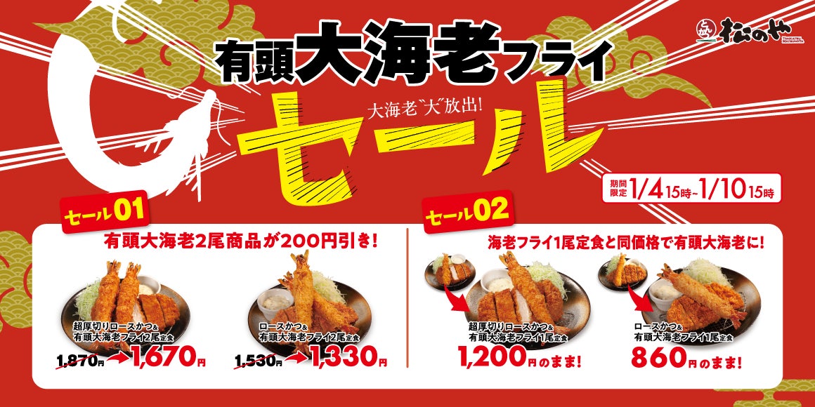 【松のや】新春をお祝いして「有頭大海老フライセール」開催!