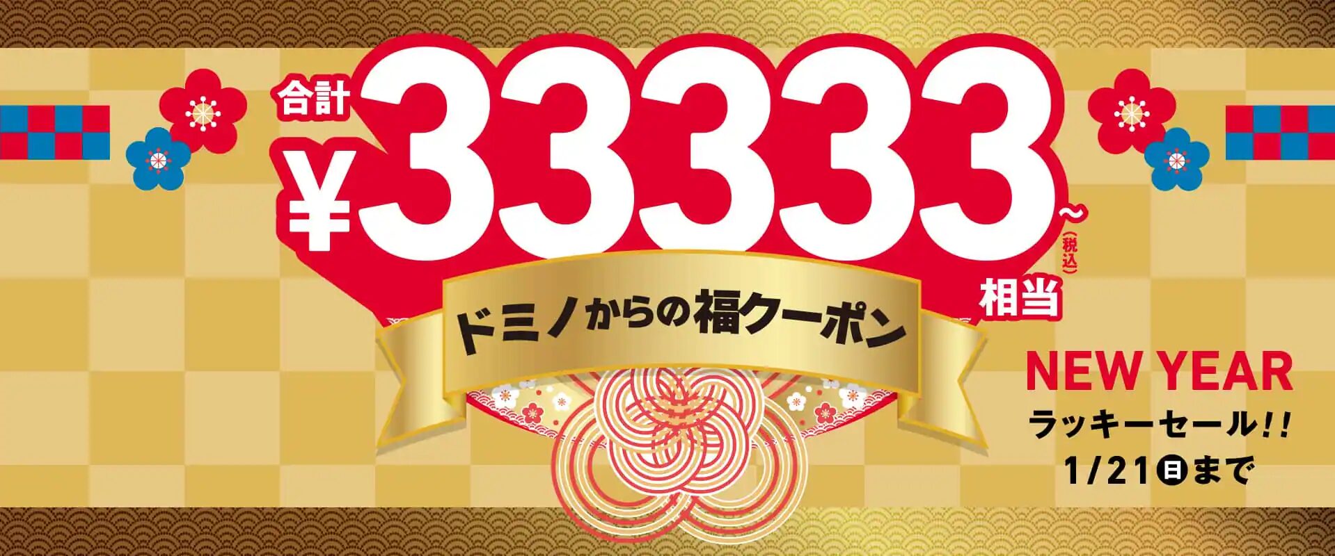 ドミノ・ピザ年末年始企画第2弾!使い放題!「ドミノからの福クーポン」 18種類で合計33,333円~相当の割引に!誰でも何回でも使えて割引上限が無制限!