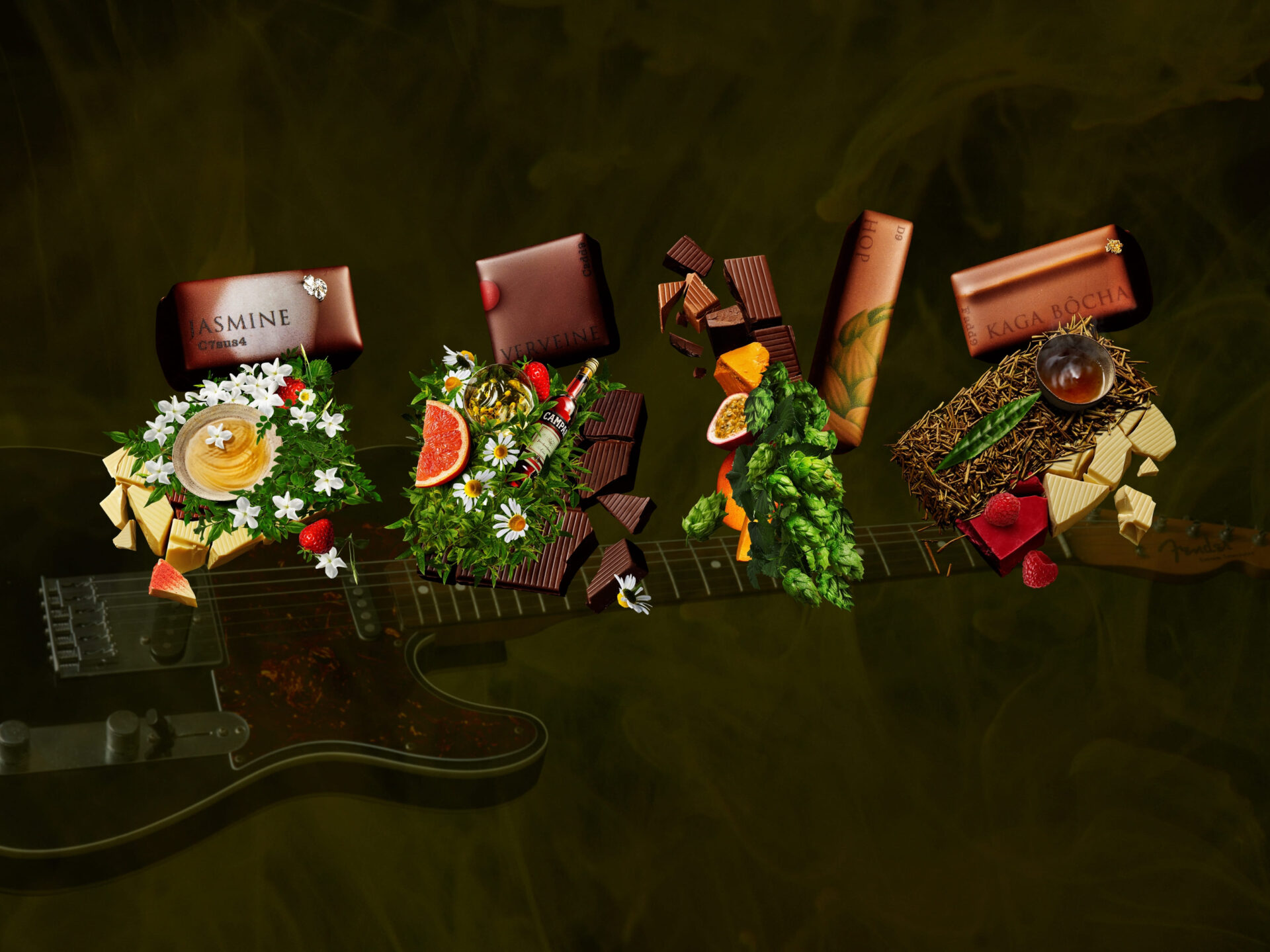京都府北部にある与謝野町で育った2種類のホップを使用。柑橘系の香りを持つ「イブキ」と、グレープフルーツを思わせる「カスケード」、後を引かないその爽やかな苦味とフルーティーなアロマに、深く焙煎した大麦をプラスすることで立体的な味わいを演出。そこに重ねたのはエキゾチックな雰囲気が漂う南国フルーツ。マンゴーのねっとり濃厚な甘味とパッションフルーツのトロピカルな酸味を巡らせて。フレンチ料理の1皿の如く複雑味と大人っぽさがミックスされた、ガストロノミーショコラらしい作品へと導きました。