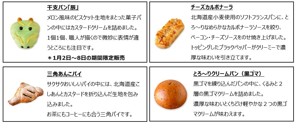 また、1月の新商品として2日から寒い季節にあたためて美味しい「チーズカルボナーラ」や、ホットコーヒーなどにもぴったりの「三角あんこパイ」、人気のとろ~りクリームパンに新しい味の「とろ~りクリームパン(黒ゴマ)」の計4種類を発売します。