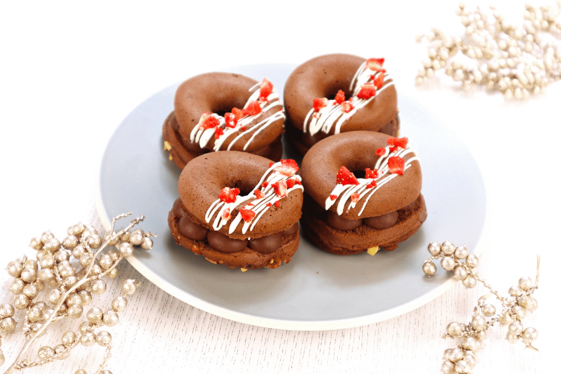 ・価格:2,580円(税込)・糖質量(1個あたり):3.8g(※7)・総重量:約50g・内容量:1箱4個入厳選したカカオマスと北海道産純生クリームとバターをたっぷりと使用したショコラドーナツ。生地は、きめ細かく立てたメレンゲを加えふんわりとスフレ状に仕上げ、口溶けなめらかな生チョコでサンドしました。ドライ苺のほのかな酸味、凝縮された香りがチョコレートを引き立てます。(※6)一般的なドーナツ(プレーン)の糖質量を50gあたり29.5gで算出(2023年日本食品標準成分表より)(※7)エリスリトールを除く