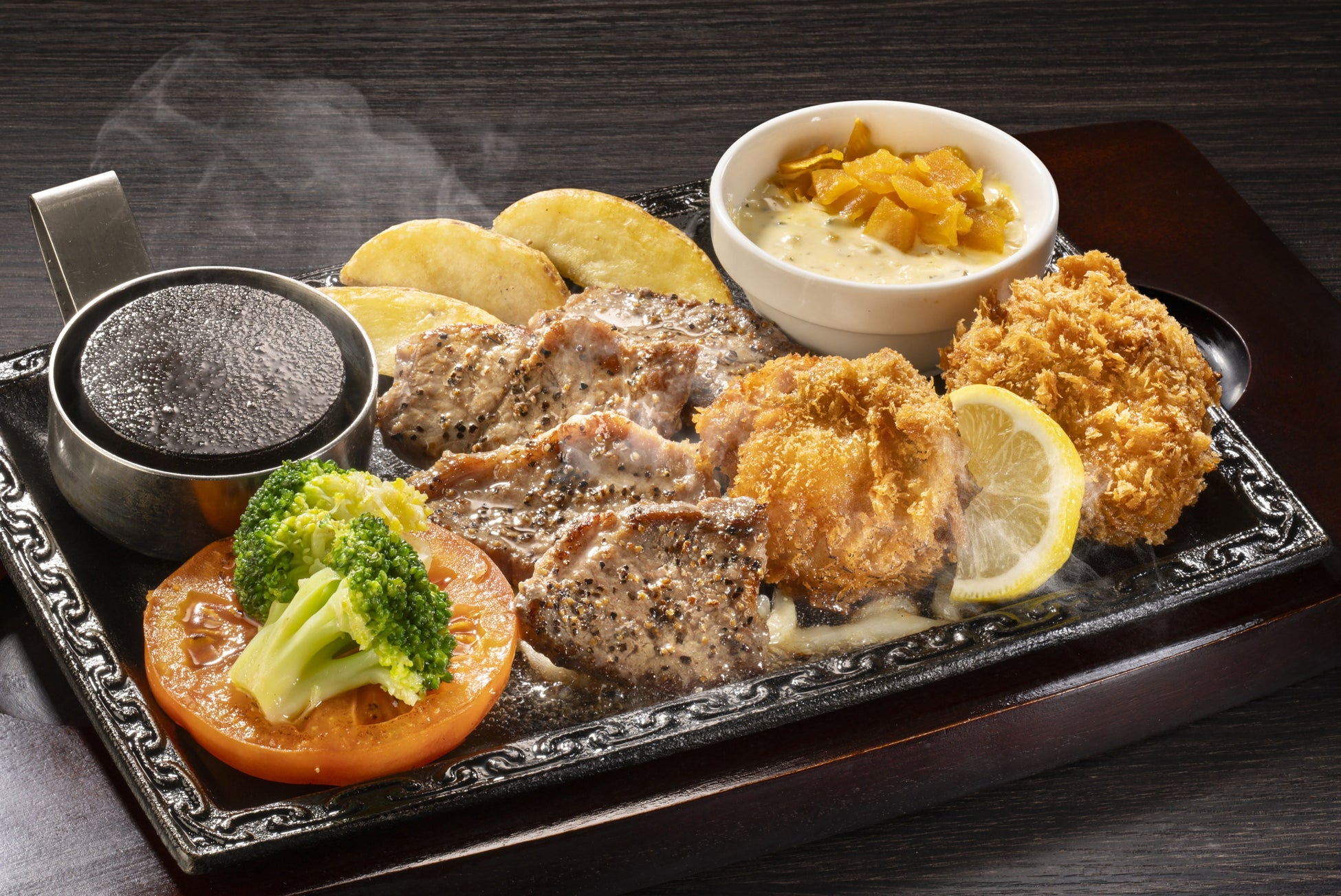 | 【年末年始限定の特別メニュー おすすめポイント】 ①【美味しさ味わう厚切り】“4等級以上”の黒毛和牛「厚切りサーロインステーキ」 ②【こだわりの店内仕込み】肉厚で良質な“北海道噴火湾産帆立”をフライで提供 |