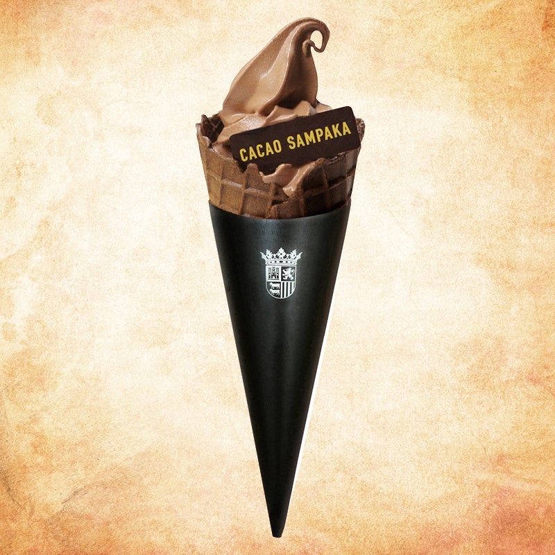バルセロナに本店を構える、スペイン王室御用達のショコラテリア。香り高いカカオパウダーを贅沢に使ったチョコレートソフトクリームは、濃厚ながらすっきりとした後味に仕上げられています。 <カカオサンパカ>のロゴチョコレートプレート付き。