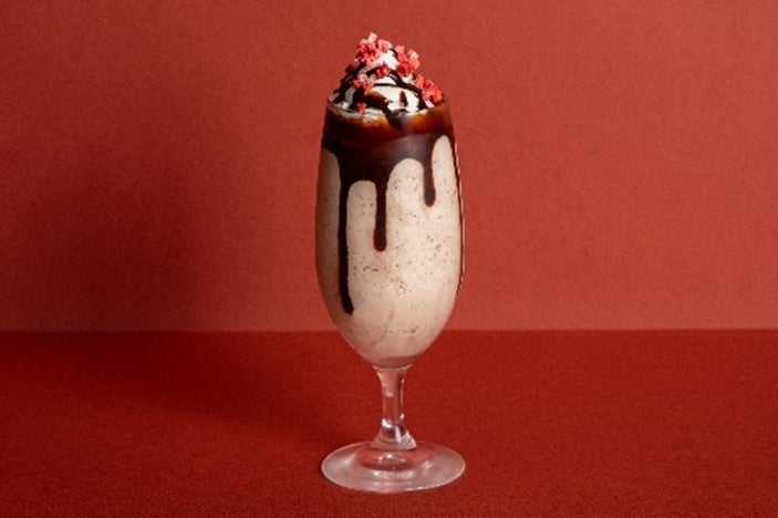 白ごまとバニラアイス、ダークチョコレートのベースに、チョコレートソースを加えたチョコ尽くしのバレンタイン限定シェイク。一口でチョコレートと白ごまの風味が感じられる、香り豊かな一杯です。