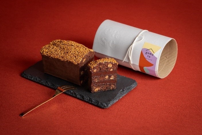 「ごまと大納言のチョコテリーヌ」は、表面にキャラメリゼした白ごまをまぶし、中には濃口のごま油を使用したガナッシュ・白ごまのプラリネ・大納言が練り込まれた生地を使用しています。濃厚なチョコと香ばしいごまの風味がお互いを引き立て、大納言が入ることにより和を感じられる、新感覚のチョコテリーヌです。