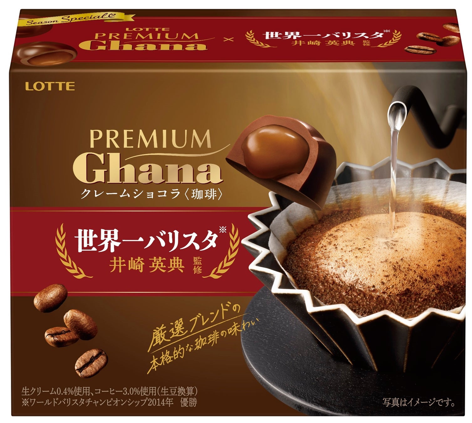 世界一バリスタ※井崎英典氏監修の上質なひと粒ショコラです。ロッテ独自の技術で仕立てた、珈琲と生クリーム入りのとろ~りとしたショコラソースを、濃厚なガーナミルクで包み込みました。コロンビア産・ブラジル産・エチオピア産の珈琲豆をそれぞれ使用した、3種の厳選した珈琲※1を、0.1%刻みでブレンドすることで、本格的な珈琲の味わいとガーナミルクとの繊細な味の移り変わりが楽しめます。