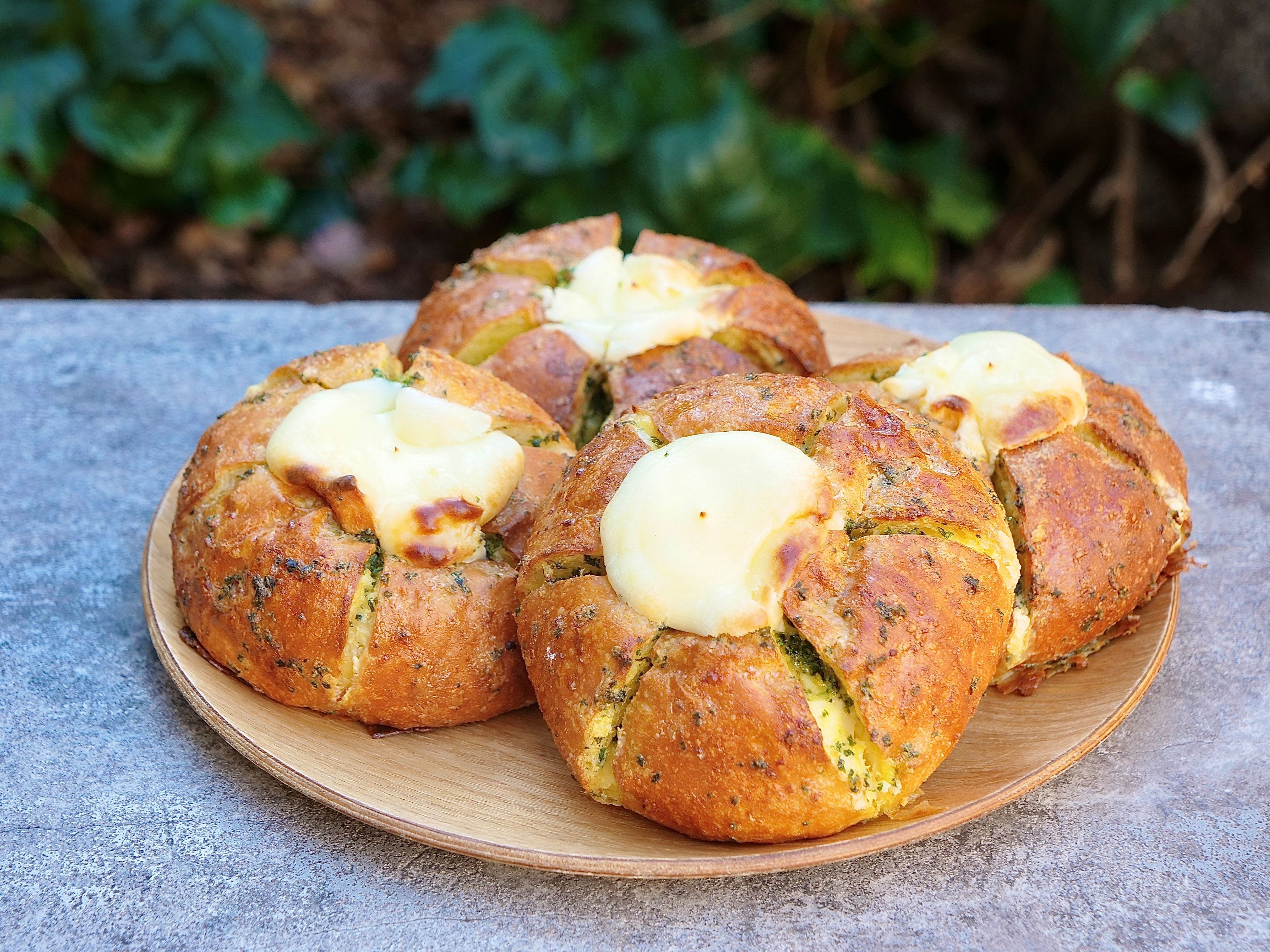 パンをたっぷりのガーリックバターにくぐらせ、クリームチーズを挟み焼き上げたパンです。