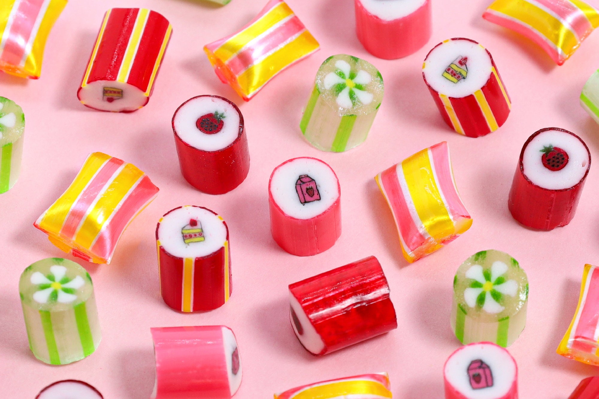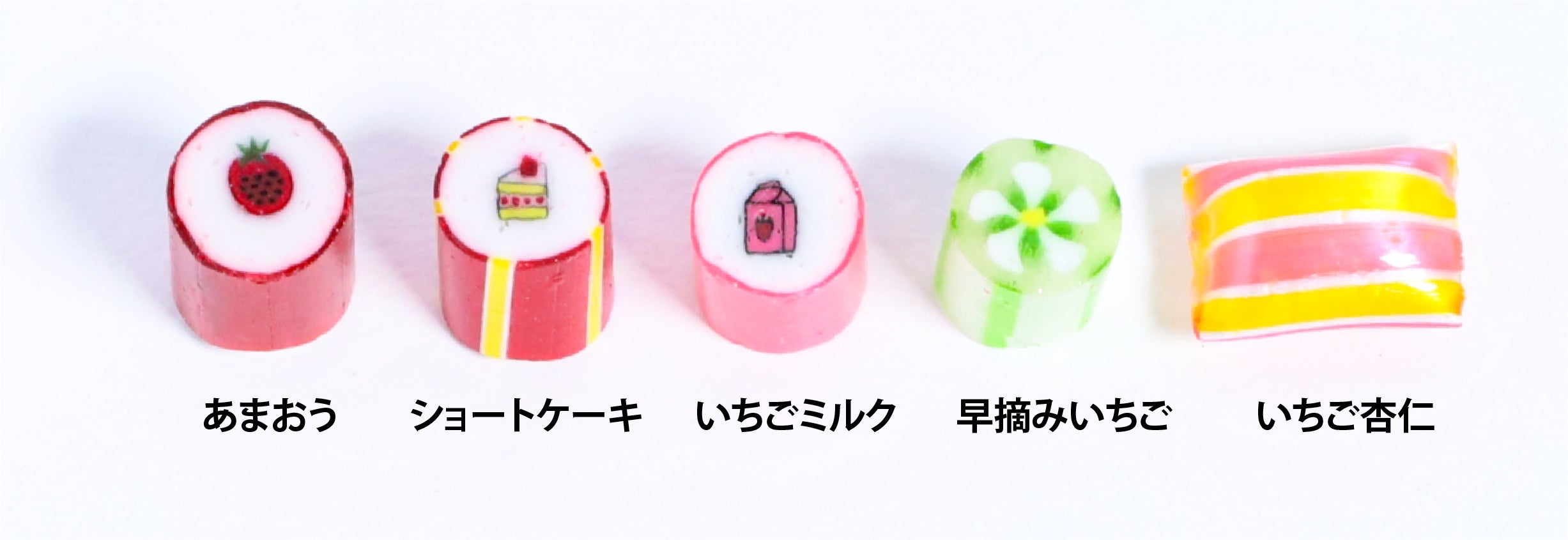 今年のいちごミックスは、デザイン・フレーバー共に一新しました。「ショートケーキ」や「いちご杏仁」などキャンディでは中々味わうことのできないユニークな味に加えて、「牛乳パック」や「いちごの花」といった可愛いデザインのキャンディをミックスしています。
