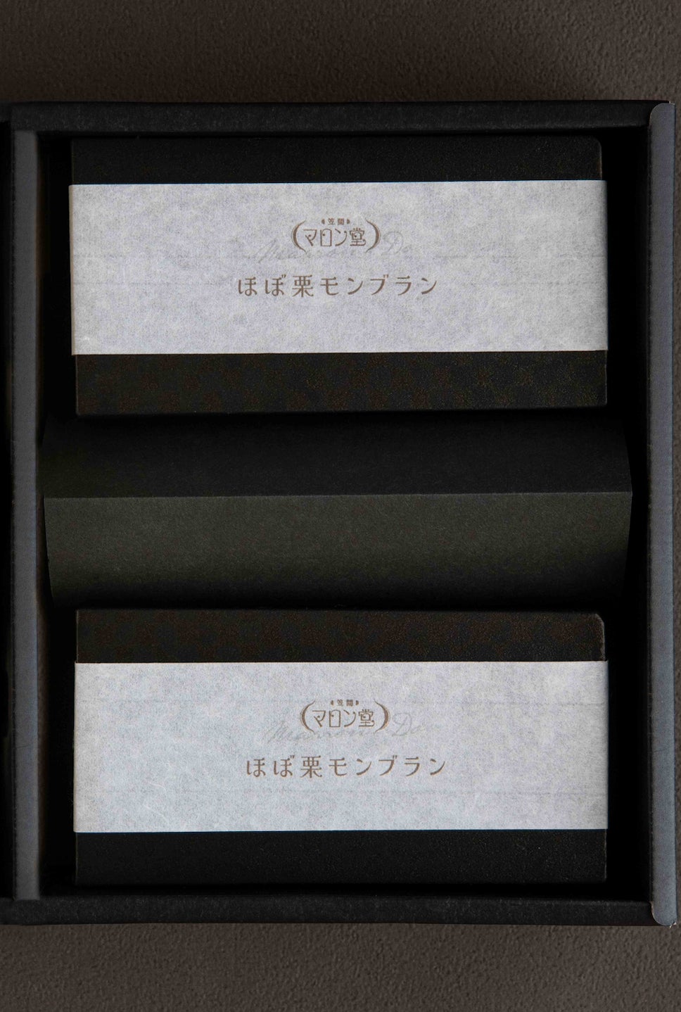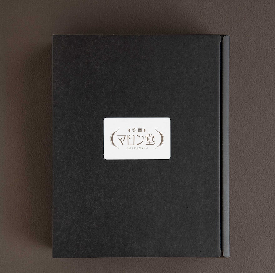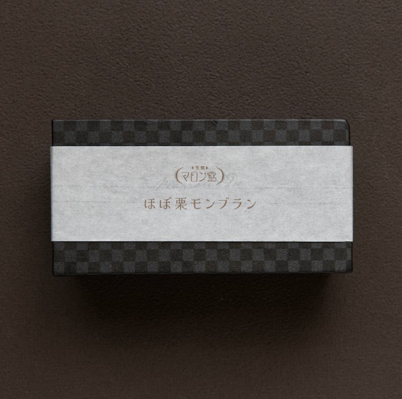 ほぼ栗モンブランのパッケージは、市松模様の装飾ギフトボックスに、茨城県無形文化財指定の西ノ内和紙を使用したマロン堂ロゴ入り帯をつけてより上品な印象に。