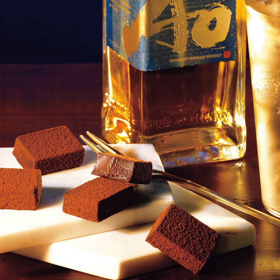 華やかに香り立ち、ほのかなスモーキーさも味わえる「碧Ao」のハイボール。その個性に負けない、ビターテイストの生チョコレートをつくりました。豊かなカカオ感がハイボールの爽快感を引き立てます。