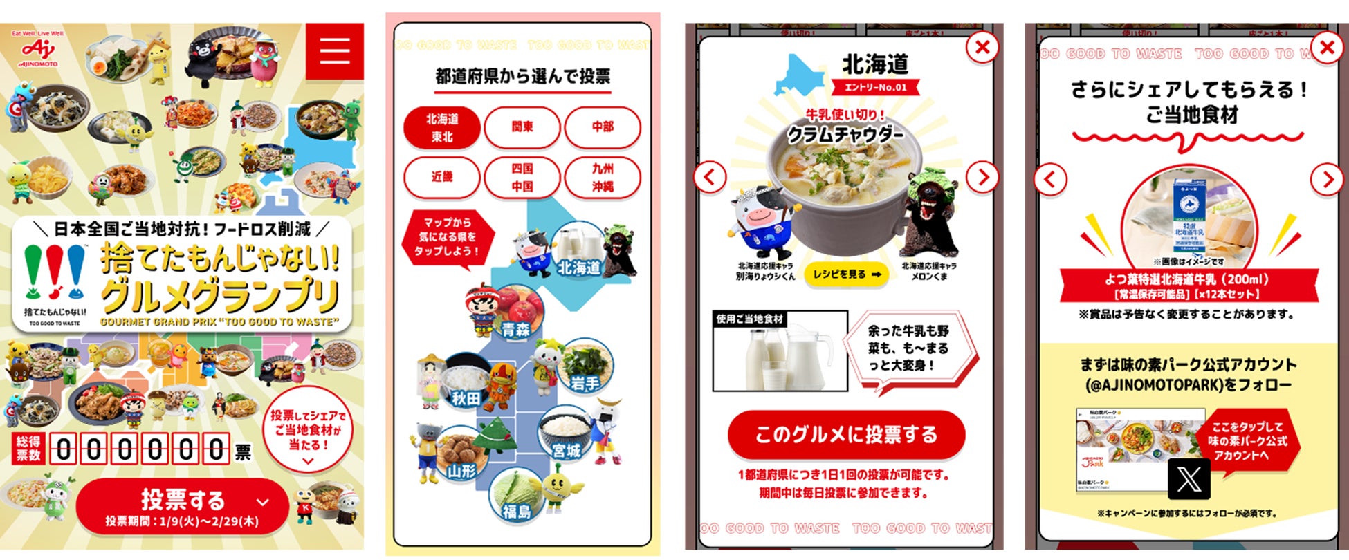「AJINOMOTO PARK」の公式X(旧Twitter)アカウント(@AJINOMOTOPARK)をフォローの上、特設WEBサイトから「捨てたもんじゃない!™」グルメに投票し、「シェアする」ボタンからご自身のXアカウントでシェアした方の中から抽選で100名様にご当地食材が当たります。さらに、公開された「捨てたもんじゃない!™」レシピで実際にアイデアグルメを作って料理の写真をXに投稿すると、ご当地食材の当選確率が2倍になります。当選者にはDMにてご連絡します。