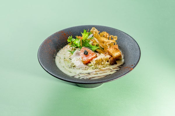 「フレンチ」×「サーモン」×「ラーメン」をコンセプトに、1匹のサーモンを頭から骨の髄までを使い、フレンチ歴14年の熟練の知識と技術で仕上げた、究極のサーモンラーメンをご堪能ください。