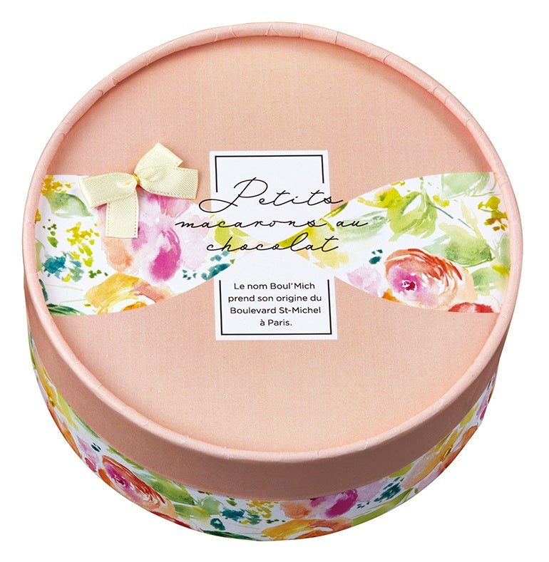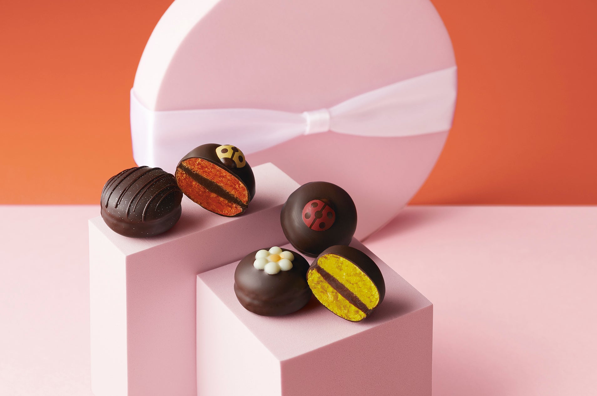 説明:4種のフルーツガナッシュのマカロンをチョコレートでコーティング