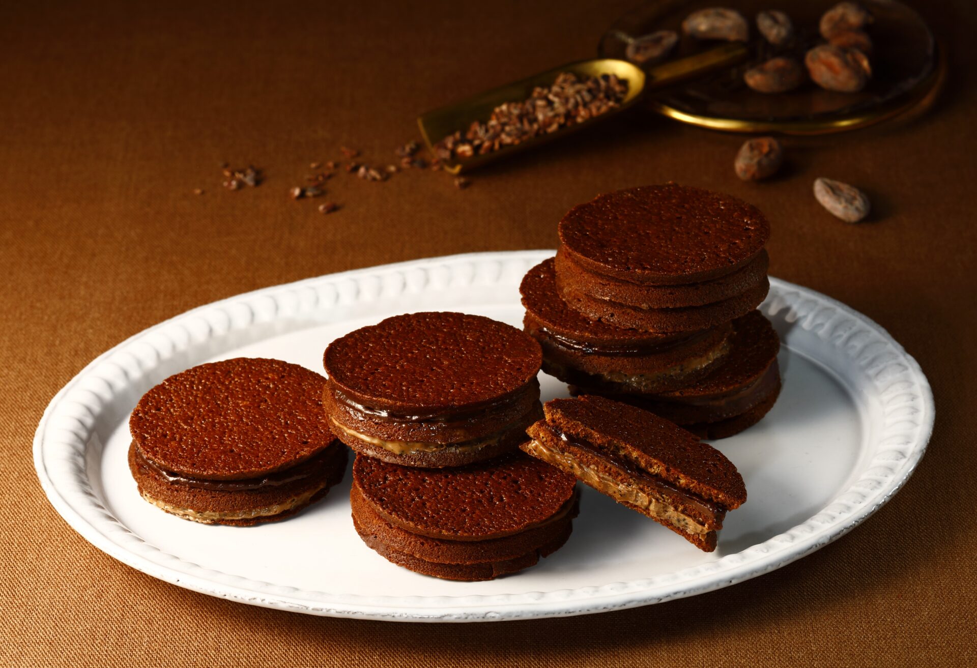 カカオマスをあわせたキャラメル仕立てのクッキーで2種類のチョコレートをサンドしました。