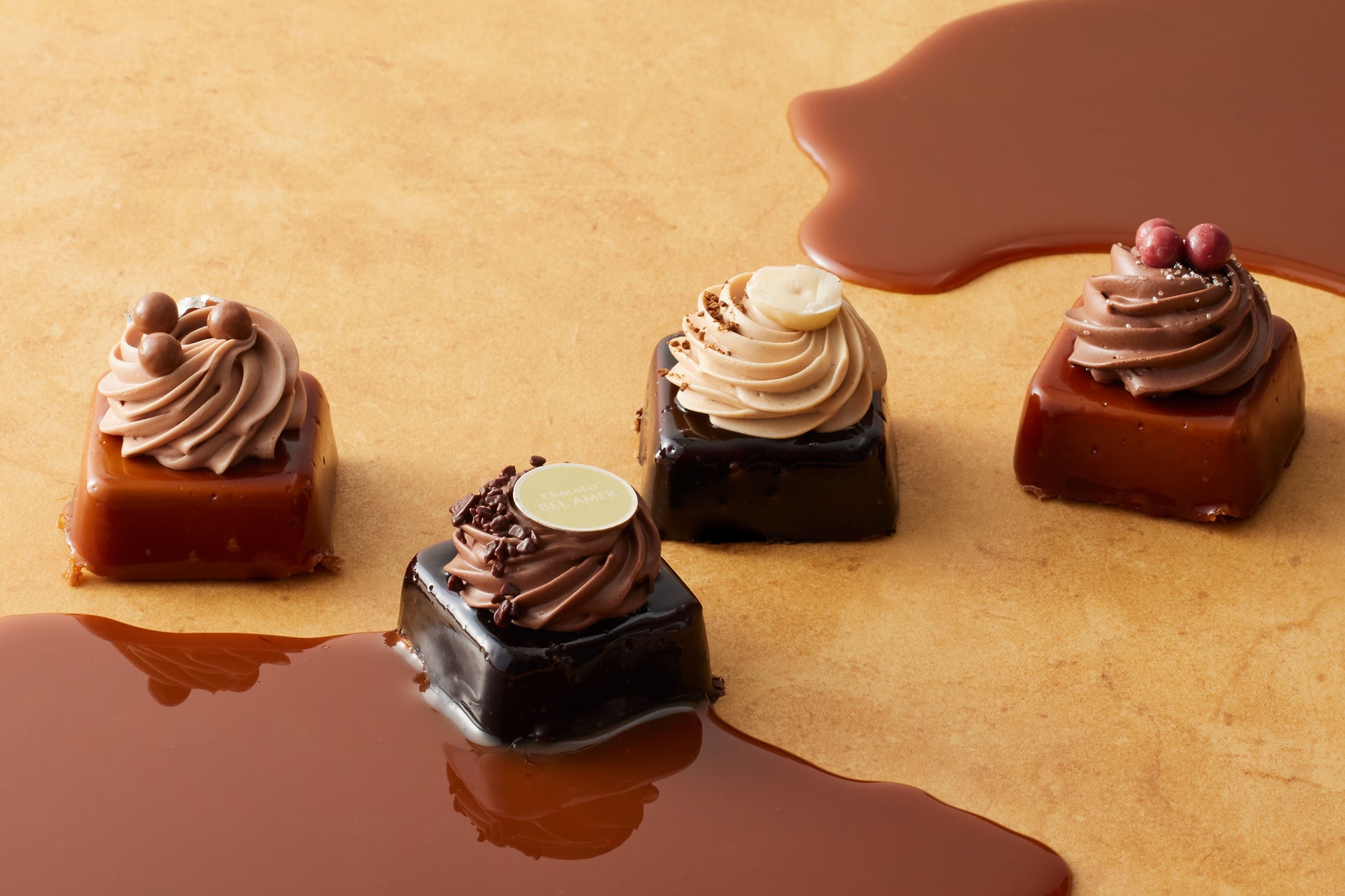 キャラメルと相性のよいミルク、ビター、カフェ、フランボワーズの4種のフレーバーをアソートしました。