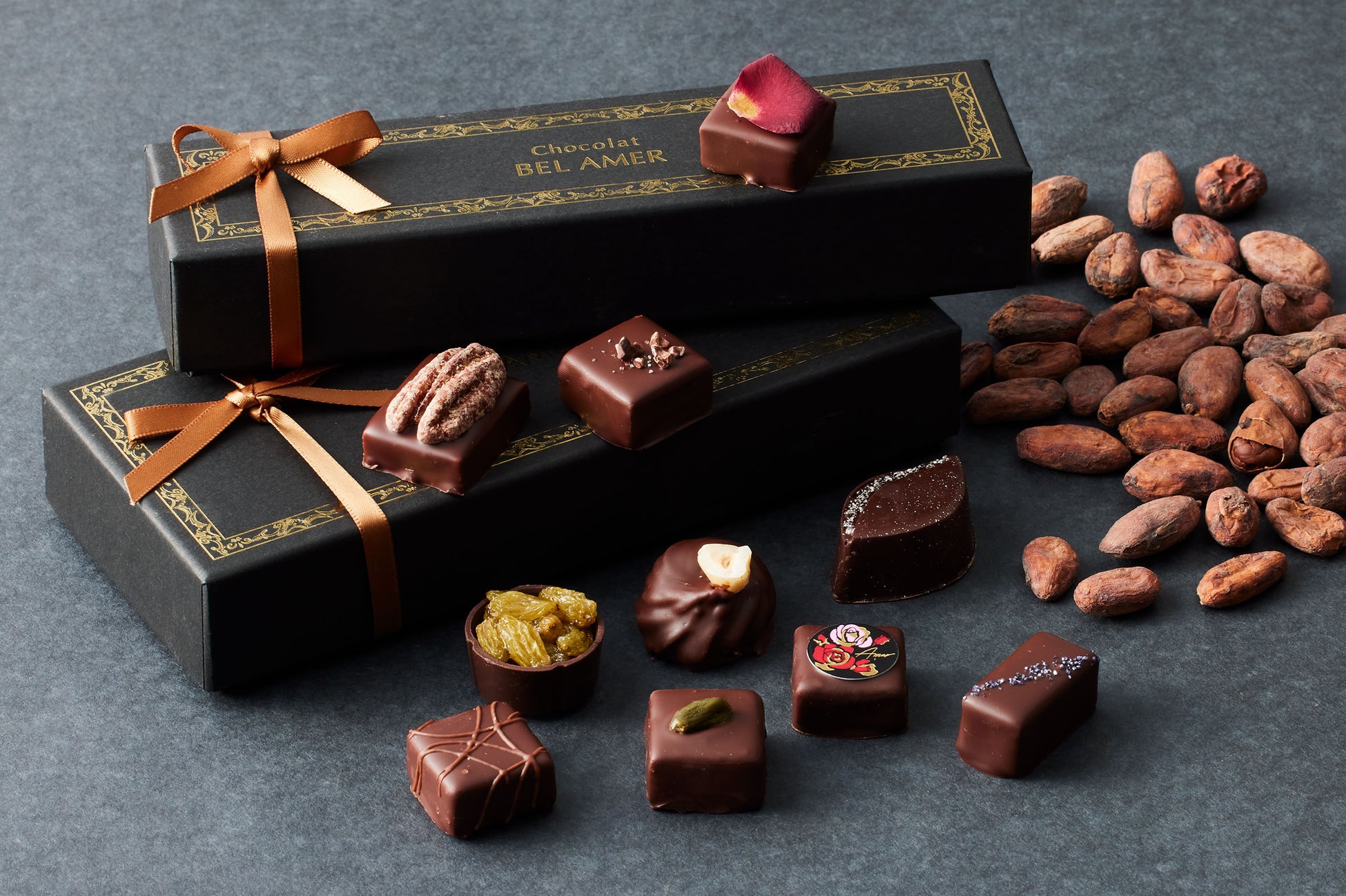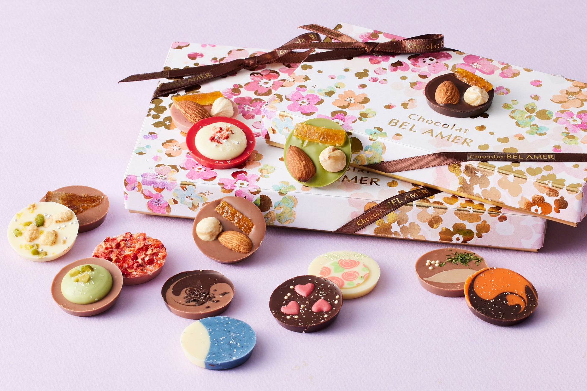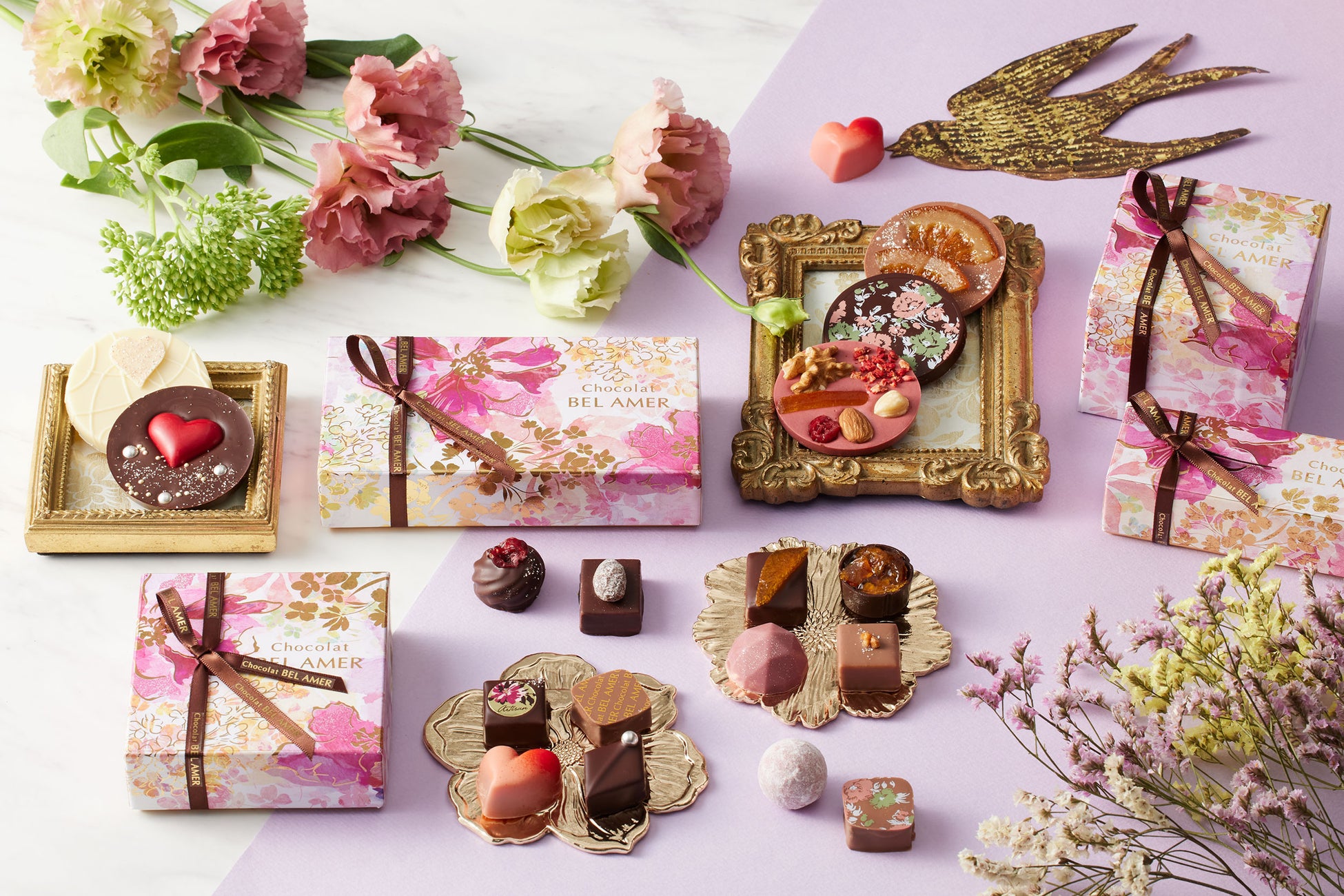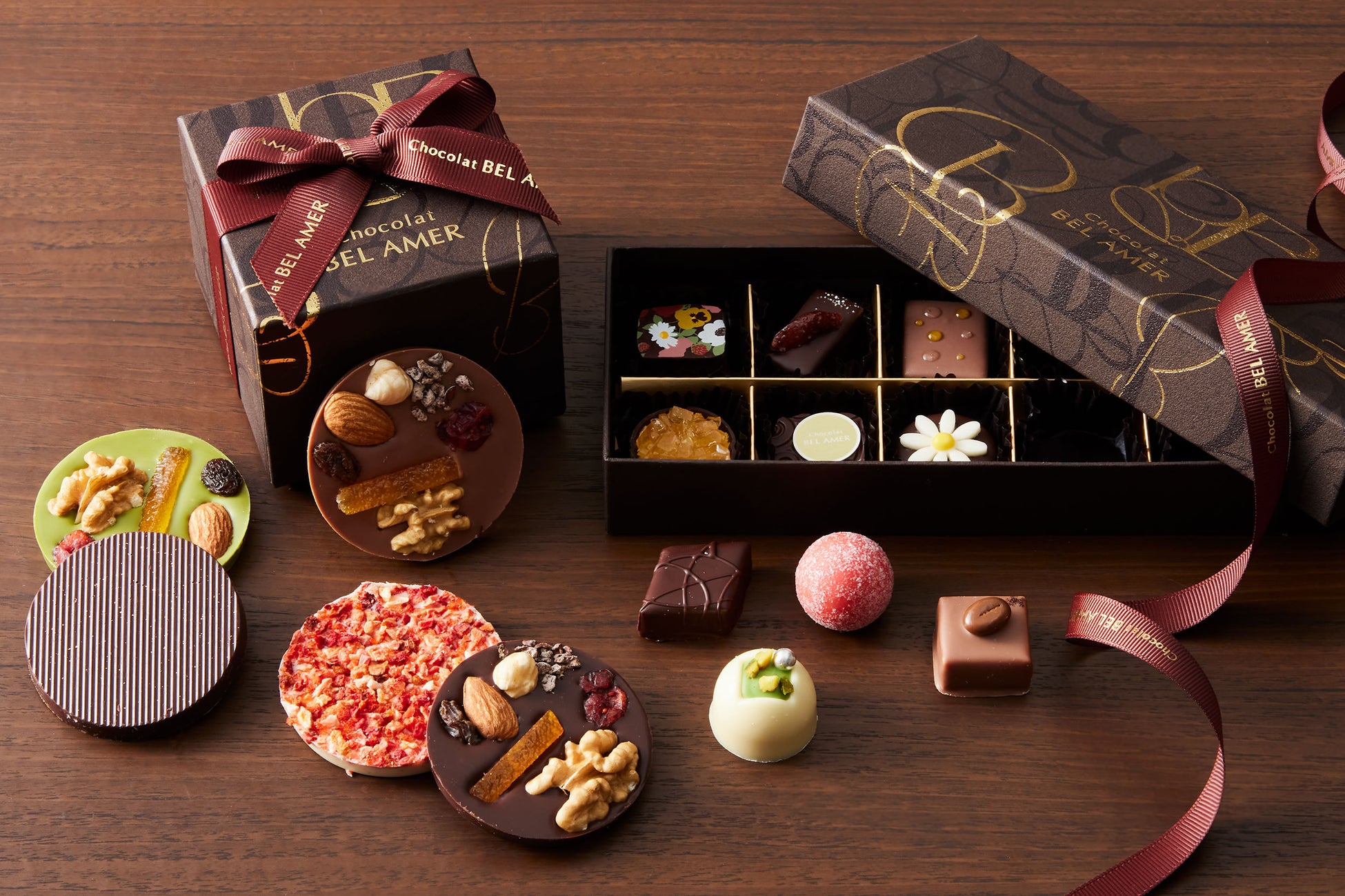 ベルアメールの看板商品であるパレショコラのギフトと、ショコラと素材の組み合わせを楽しむボンボンショコラのギフト。