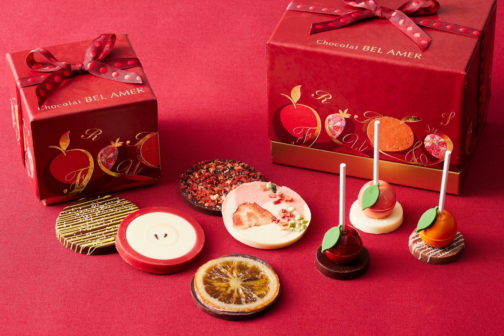 オレンジ、苺、りんご、レモンなど4種のフルーツをテーマに、様々な形でフルーツを取り入れたパレショコラギフトと、センターにとちあいか苺、紅玉りんご、伊予柑のピューレの自家製ジュレを入れ、フルーツのジューシーさを楽しむロリポップ型ショコラ。