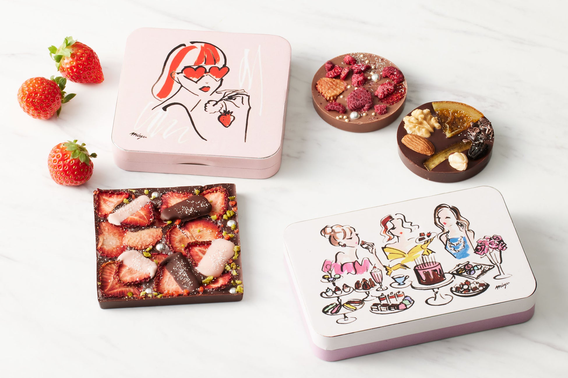 自家製ドライ苺やフランボワーズ、ナッツやドライフルーツで華やかにデコレーションしたプレミアムなパレショコラや、あまおう苺の自家製ドライフルーツを贅沢に敷き詰めた約8.5cm角のタブレットショコラを人気イラストレーター「大橋美由紀」さんが手掛けるオリジナルイラストの限定缶にセットしました。