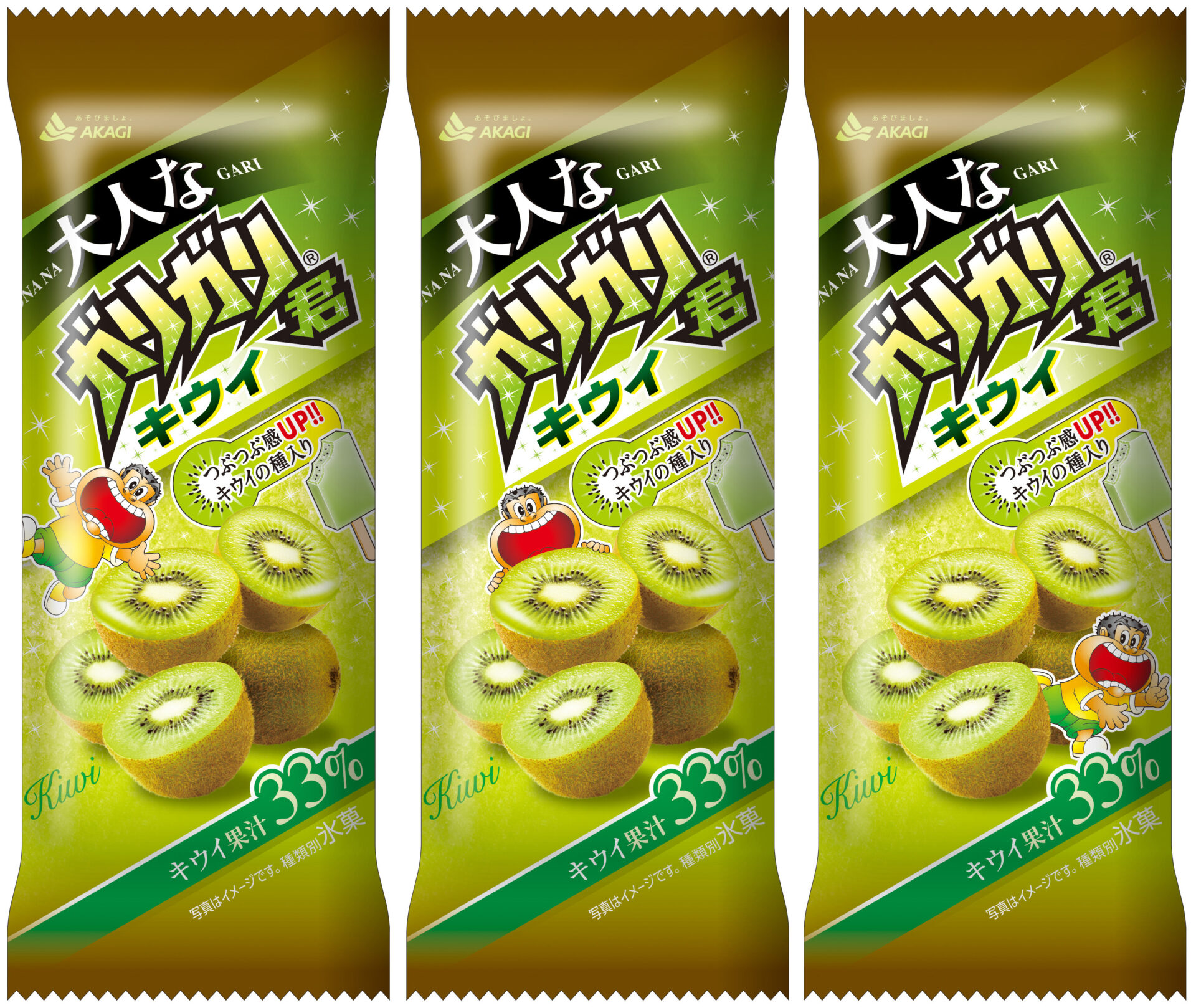 「大人なガリガリ君キウイ」は、キウイアイスの中に、キウイの種が入ったジューシーなキウイかき氷を入れたアイスキャンディーです。キウイ果汁33%使用した、本格的な果汁感が味わえる商品です。