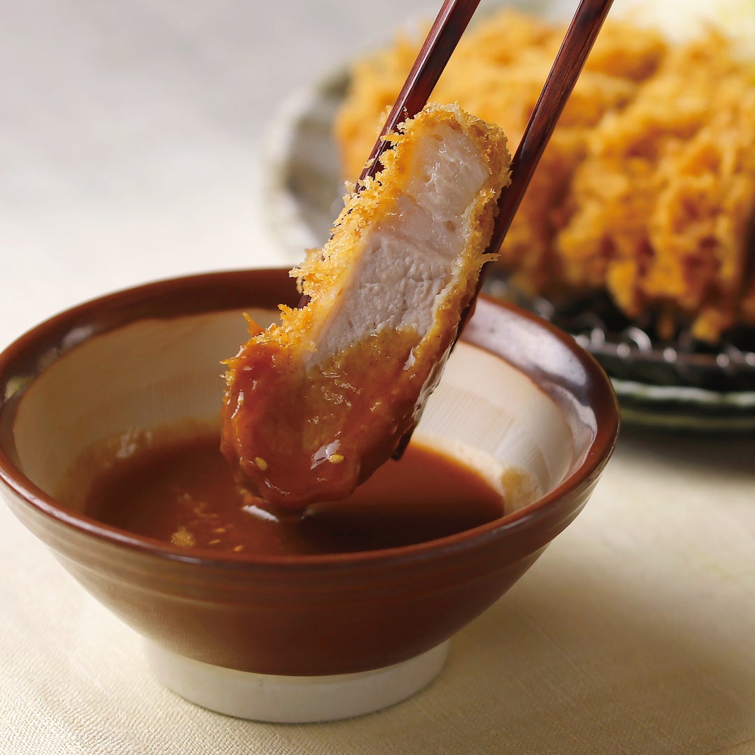 赤ワインにりんごとナツメヤシを加えまろやかさとコクを引き出した、かつくら自慢のとんかつソース。スパイスをバランスよくブレンドした、濃い口ソースもご用意しております。