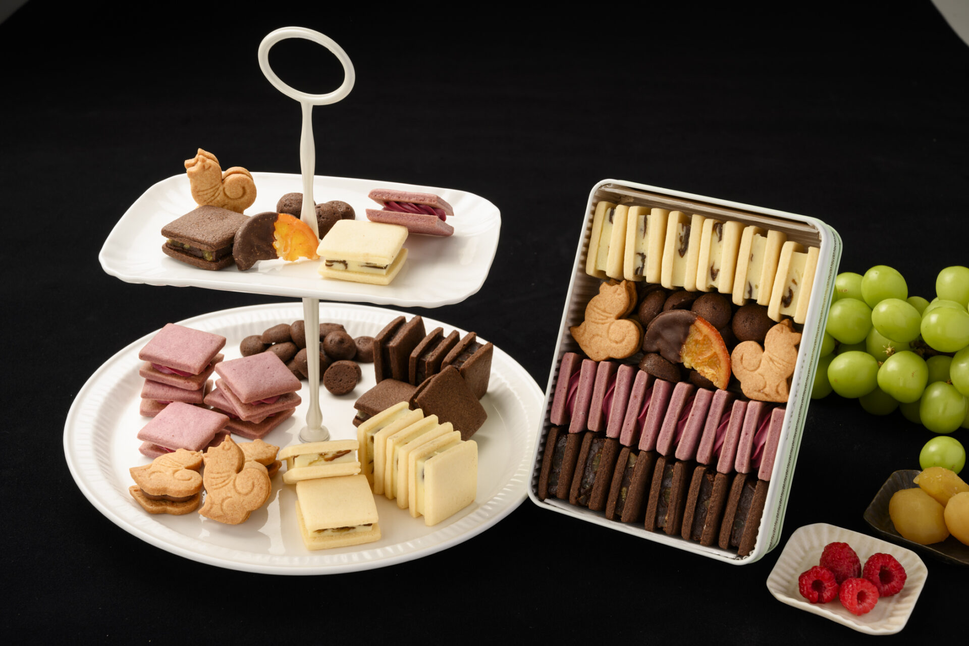 かわいらしい秋田犬クッキーのたんかんガナッシュサンドをはじめ、日本一の大きさで知られる秋田県仙北市西明寺地区特産の西明寺栗のなかでも栽培にこだわりを持つ赤倉栗園のプレミアムな善兵衛栗、秋田県産のシャインマスカット、高品質な秋田産ラズベリーなど素材豊かなガナッシュサンドがふんだんに入ったクッキー缶です。