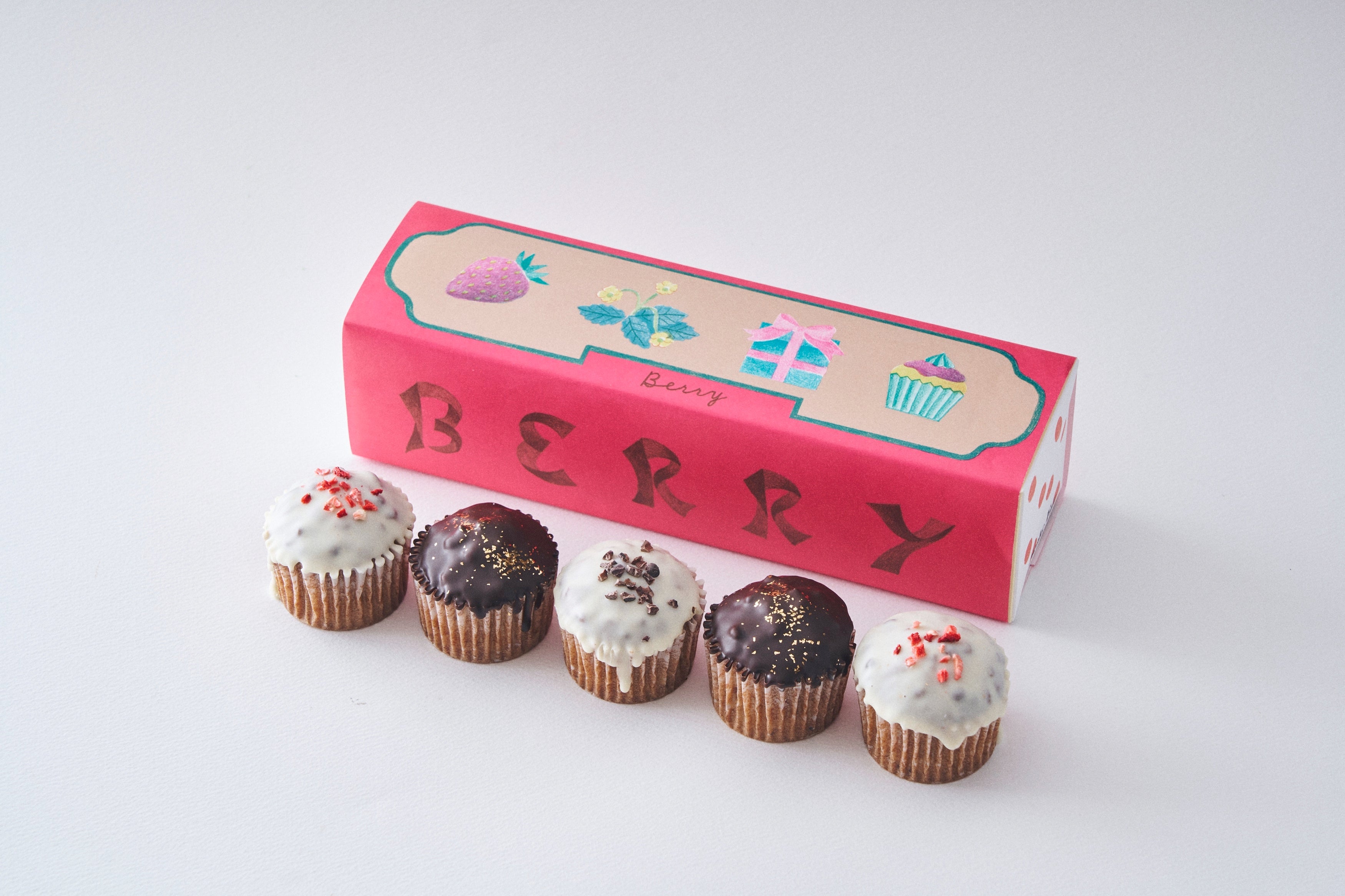ダークチョコレートやホワイトチョコレートをたっぷりとコーティングした、見た目も可愛いチョコレートカップケーキです。パリッとした心地よいチョコレートの食感に加え、トッピングにはアクセントとなるカカオニブやフリーズドライいちごを、工房の職人が一つ一つ丁寧にデコレーションして仕上げています。