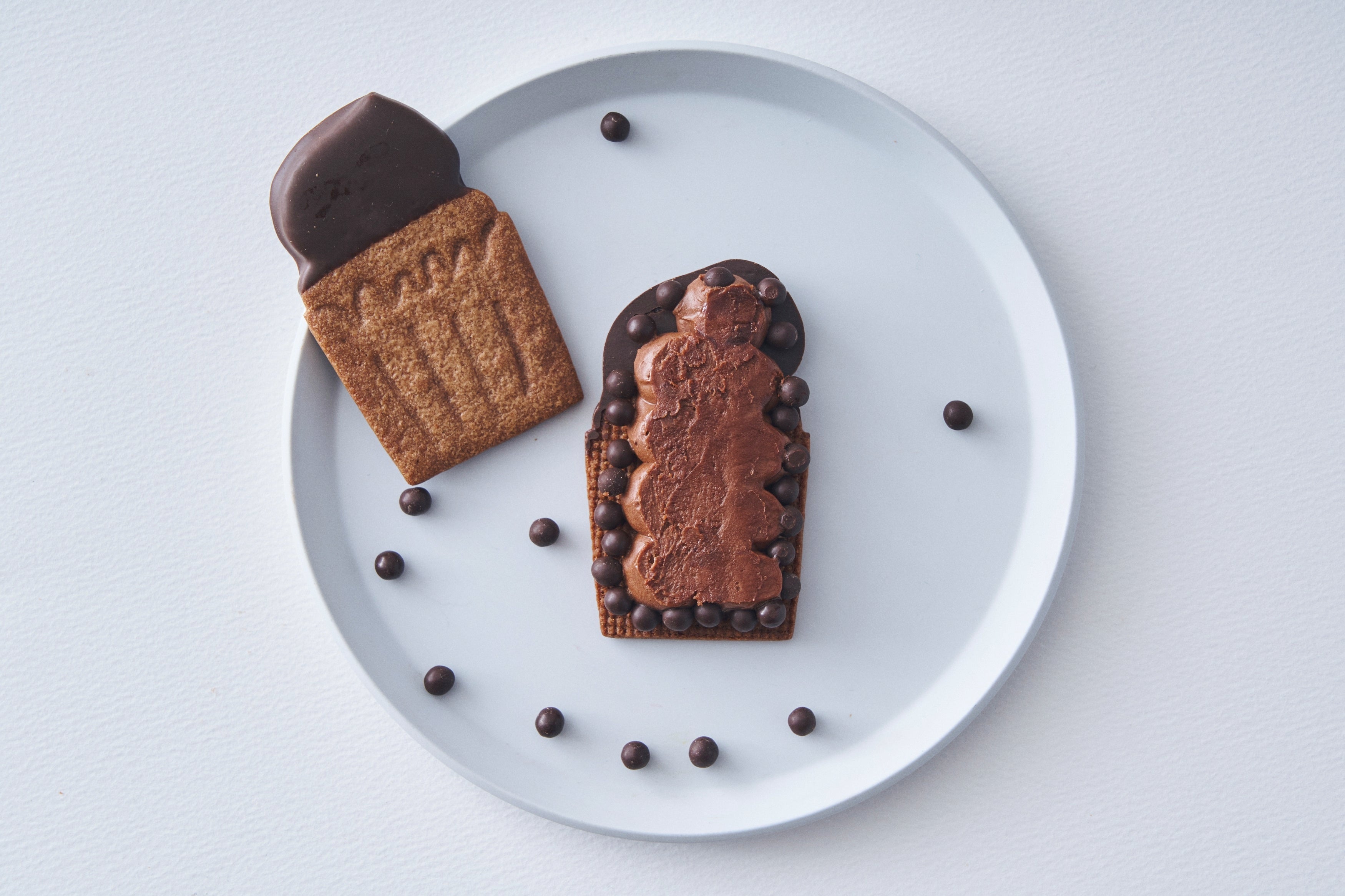 世界のトップパティシエやショコラティエが愛用するフランス・ヴァローナ社の高級チョコレートをたっぷりと使用。「コンサントレ・ド・ショコラ(濃縮されたチョコレート)」とも呼ばれる高品質なチョコレートを使い、その名の通りカカオの風味溢れる濃厚なガナッシュを混ぜ合わせた特製生バタークリームを、丁寧に焼き上げた香ばしいカカオビスケットで一つ一つサンド。ビターな甘さでしっかりとした深いコクとともに、カカオの豊かな香り、リッチで濃い味わいが特徴です。カカオの鮮烈な風味に、濃厚ながらも軽やかな食べ心地で贅沢に仕上げました。
