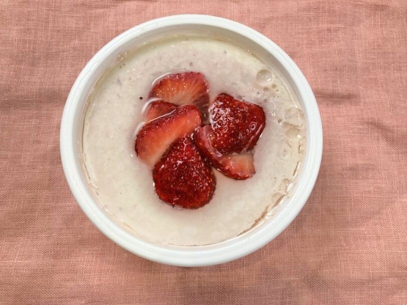 豆乳にいちごソースを混ぜてお豆腐にしました。爽やかな香り、いちごの甘みと豆乳のハーモニーをお楽しみいただけます。
