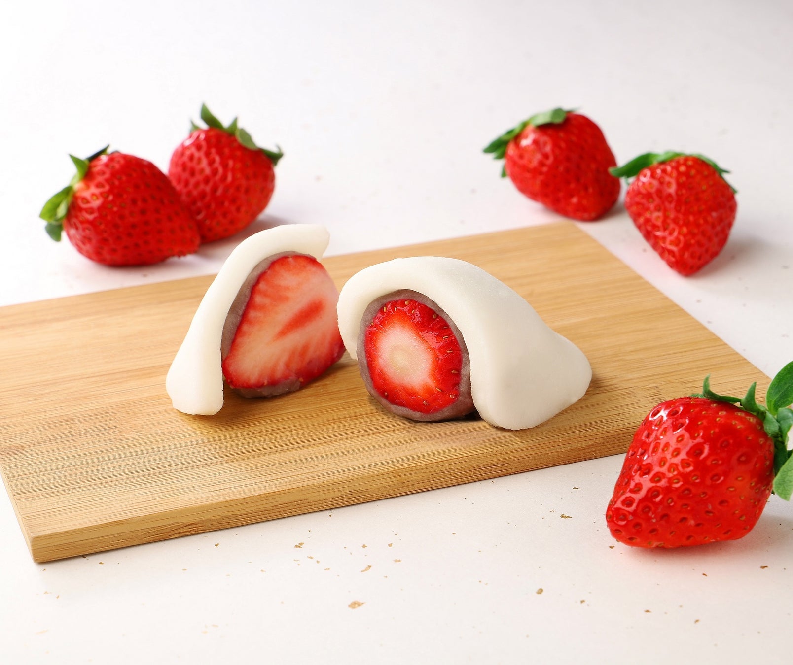 苺、羽二重餅、こし餡、全てが主役です。愛知県産の甘酸っぱい新鮮な大粒苺を口溶けの良い小豆こし餡とともにふわふわの羽二重餅でそっと包みました。