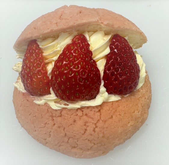 ザクザクした苺のパン生地にクリームをはさみ、フレッシュの苺をトッピング。