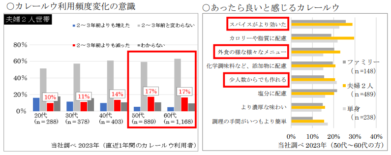また、カレールウは「簡単においしく作れる」イメージがある中で、食選択の自由度が高い夫婦2人世帯からは、より本格的な「味わい」や、少人数前からでも作れる「調理の幅」などの嗜好性の充足が求められています。