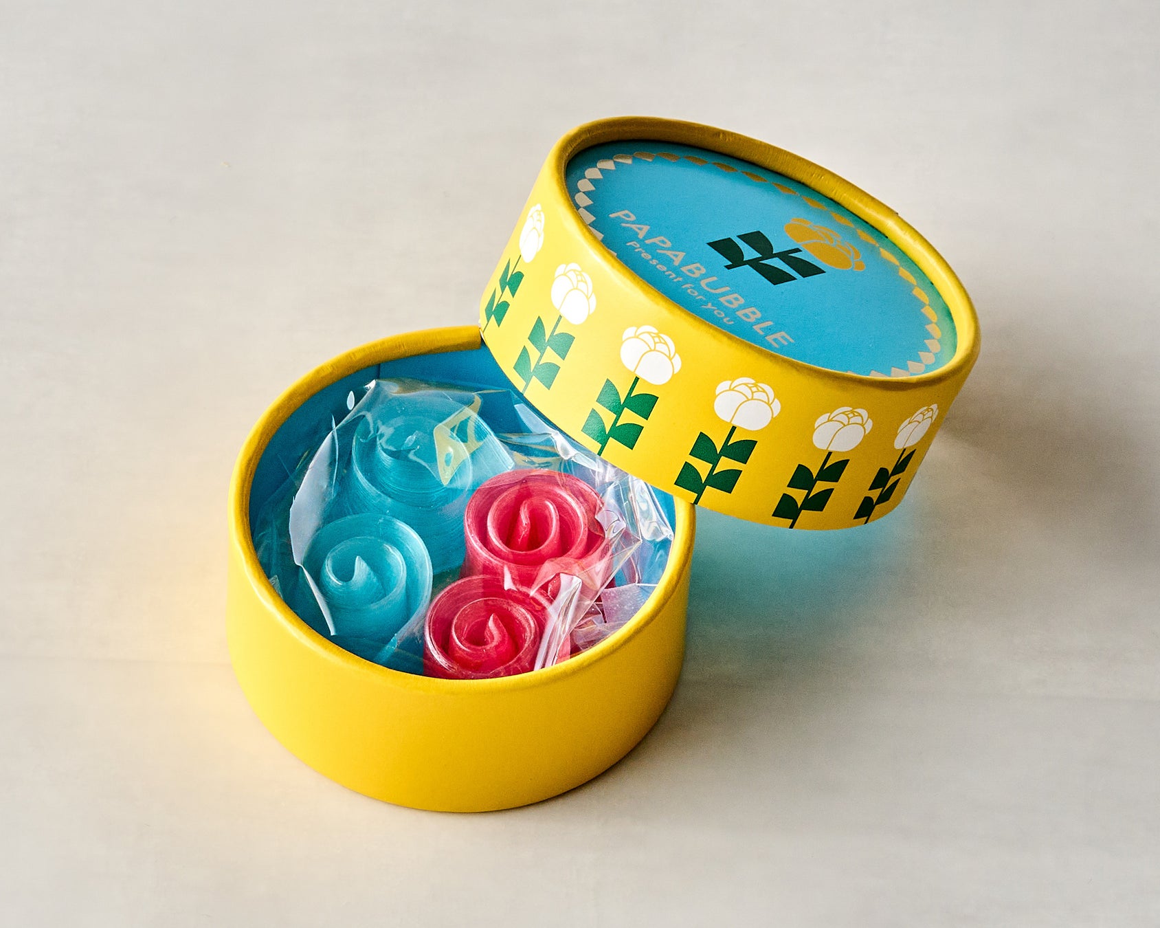 パパブブレ初、人気のオリジナル缶を使用したギフトです。ラナンキュラスをモチーフとしたイラストが描かれており、凹凸のあるデザインは自分用にも欲しくなるアイテム。大きめの缶でインパクトもあり、喜ばれること間違いなしの商品です。中身は「ホワイトデーミックス」「かおミックス」「バブレッツ」「キャラメル」の4種類で、限定のキャンディにもっちり食感のグミ、秘かに人気の高いキャラメルと、この缶1つでパパブブレのいろんな商品が楽しめます。