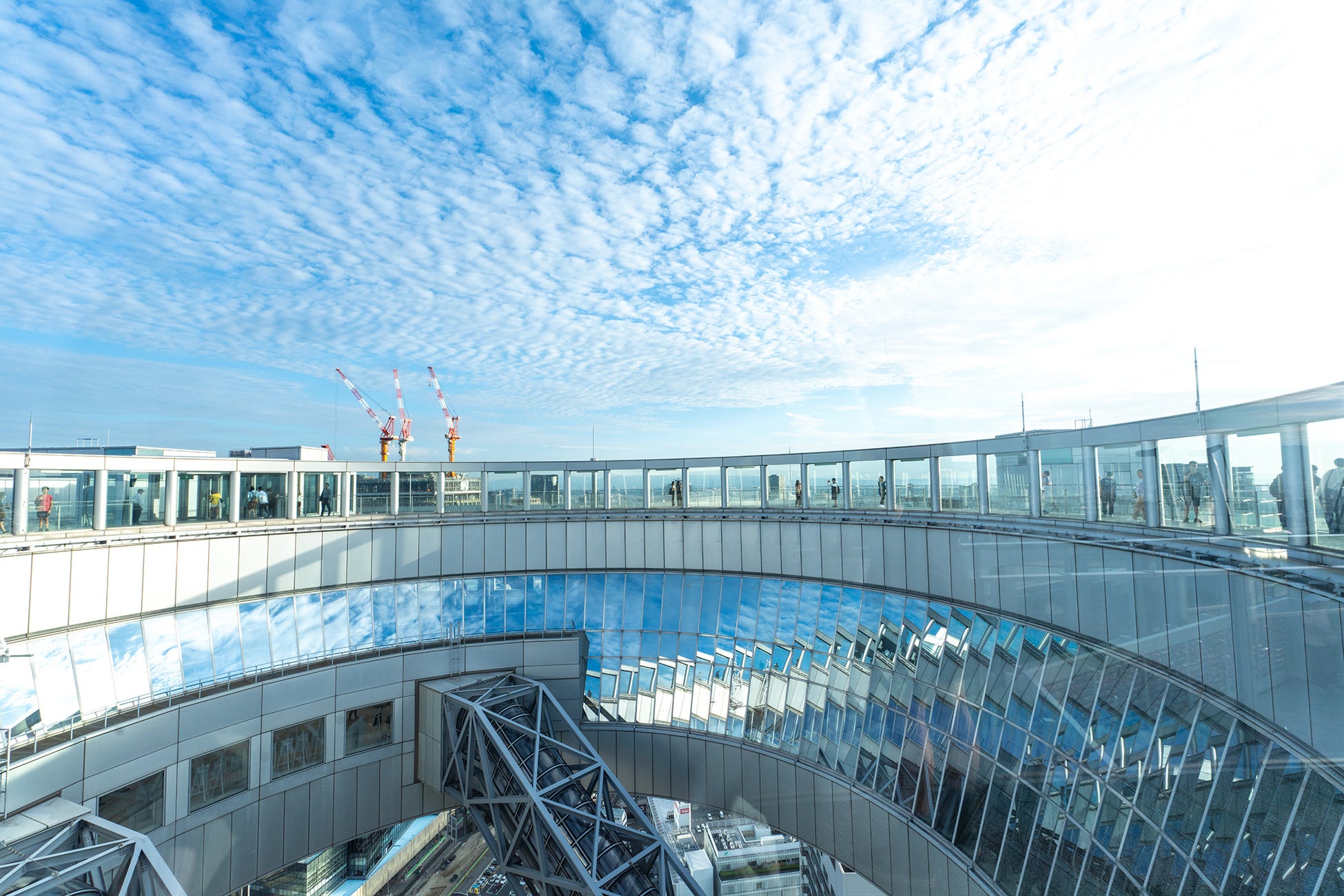 梅田スカイビルは、2つのビルが屋上を含む上層部「空中庭園」でつながる独特のフォルムの連結超高層ビル。