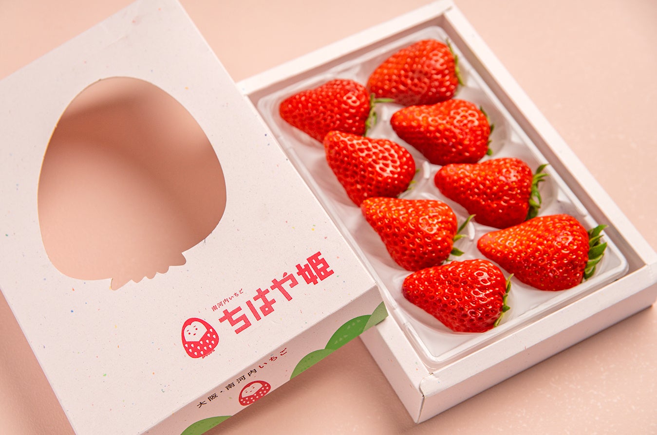 都市近郊の立地を生かして、ガクの際まで赤くなるギリギリまで待って出荷することが可能であるため、果実先端の糖度15度以上、1個40g以上、朝採れであることが条件の厳しい認定基準をクリアしたもののみが「ちはや姫」を名乗ることができる希少なブランドいちご。南河内地域ゆかりの武将である楠木正成の息女といわれている「千早姫」が語源。