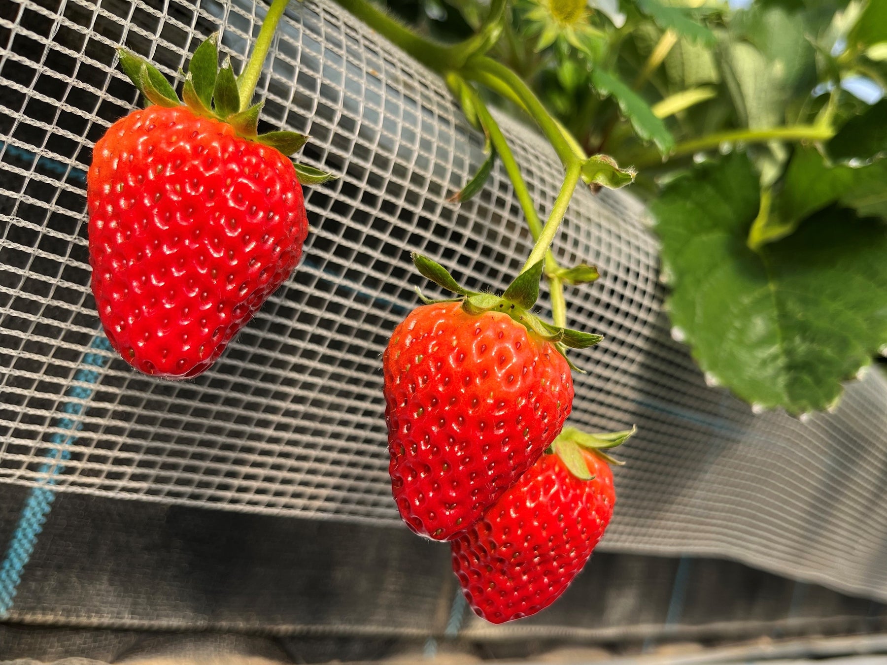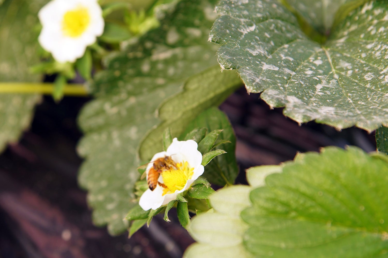 ビニールハウス内では、かわいいミツバチたちが忙しそうに飛び回り、いちごの受粉を助けていました。