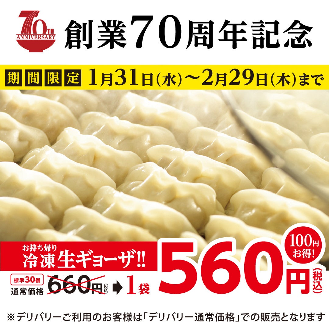 幸楽苑はおかげさまで創業70周年! 期間限定 お持ち帰り「冷凍生ギョーザ」特別価格販売!!