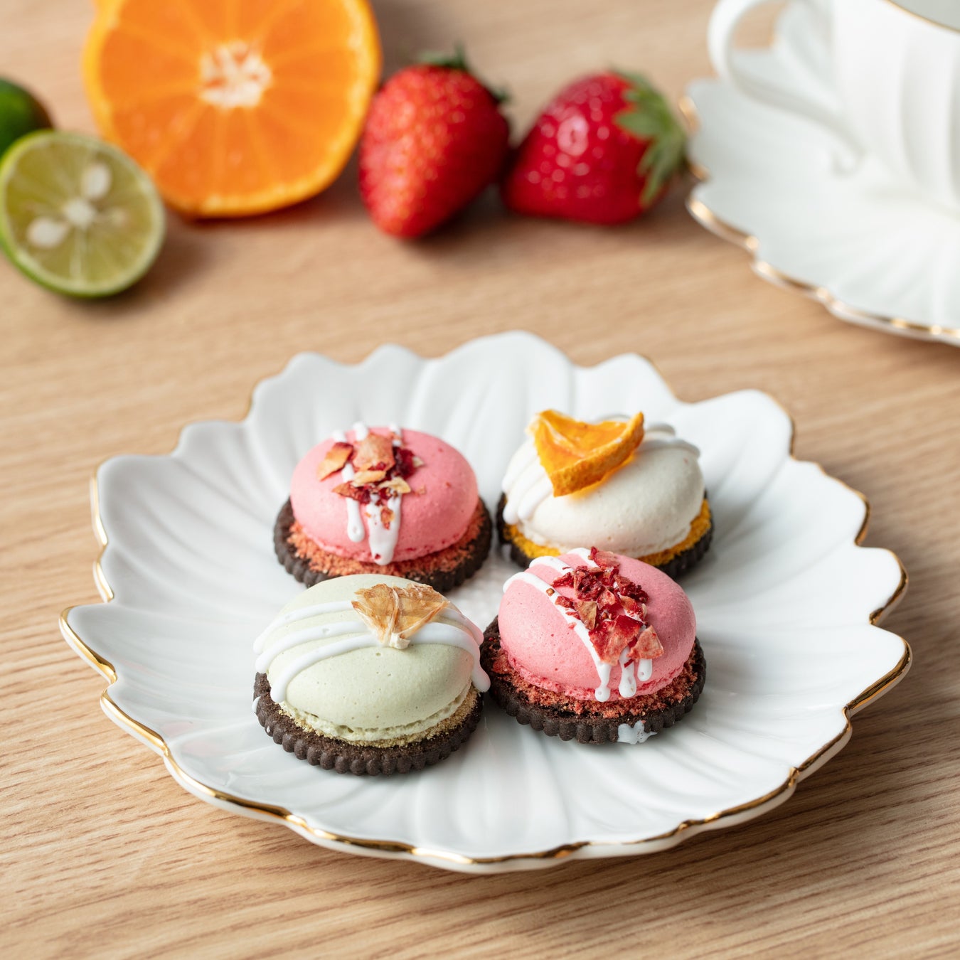 サクッとしたマカロンとビスケットの食感に、国産ドライフルーツの程よい酸味と風味が加わった味わい深いマカロンビスケットです。フルーツパウダーを生地の間に挟み、さらに上にもトッピングすることで果実感が味わえるマカロンは、紅茶やコーヒーと合わせてスイーツタイムを楽しめるほか、ワインやお酒のお供としてもおすすめです。華やかな食器とコーディネートしていつもより少し贅沢な時間をお楽しみいただけます。