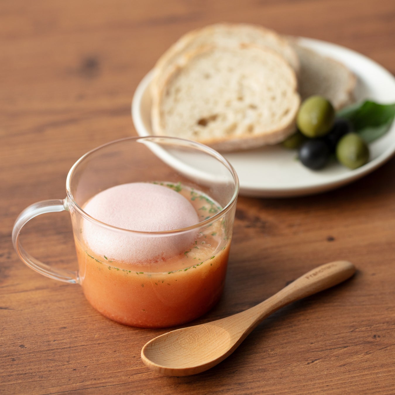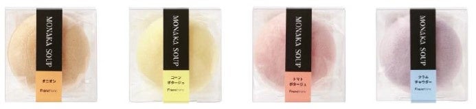 マカロンのようにカラフルでコロンとしたフォルムがかわいいもなかスープです。金沢の種屋職人がひとつひとつ焼き上げた香ばしいもなかがアクセントになっています。コンソメをベースにオニオンの甘味がポイントのあっさりした「オニオンスープ」、コーンの甘味とつぶつぶ食感が美味しい「コーンポタージュ」、トマトのほどよい酸味がアクセントになった「トマトポタージュ」、あさりの旨味がギュッと詰まった「クラムチャウダー」の4つのフレーバーを展開します。優しい味を新しい食べ方で楽しめる満足度の高い一品です。耐熱ガラスのカップでスープの彩りもお楽しみください。
