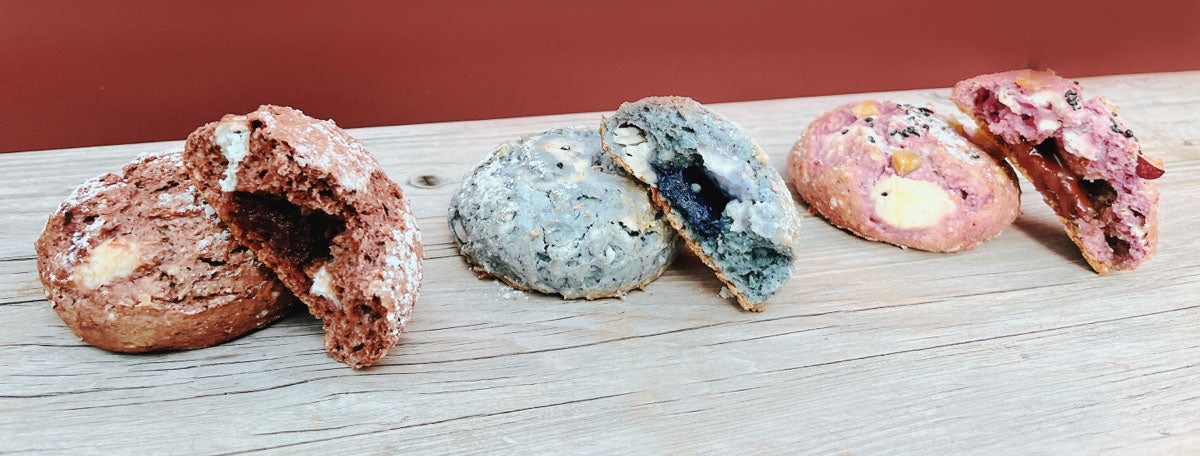 左から、ココア生地に、大人の生チョコ「スイートベルガモット」を練り込んだビターなスコーン、バタフライピー生地に青い生チョコ「バタフライピーアールグレイ」を練り込んだ鮮やかな青色のスコーン、紫芋生地に香り高い生チョコ「ほうじ茶アールグレイ」を練り込んだ可愛い紫色のスコーン