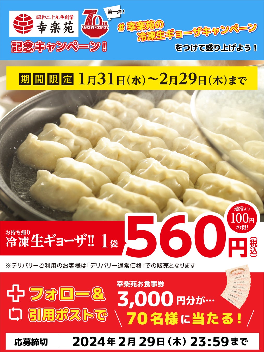 株式会社幸楽苑ホールディングス(本社:福島県郡山市)が運営する「幸楽苑」は、2024年9月22日(日)に創業70年を迎えることを記念して、2024年1月31日(水)~2月29日(木)まで、ご家庭で簡単に調理ができるお持ち帰り「冷凍生ギョーザ」(1袋標準30個入り)を560円(税込)の特別価格で販売します。