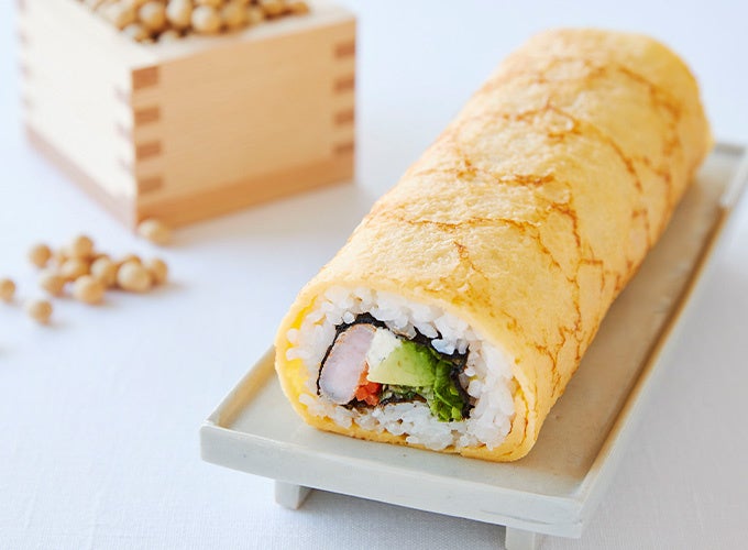 ひと味違うおいしさで福招き。クリームチーズが味のポイント。甘みのある玉子で包んだサラダ恵方巻きです。