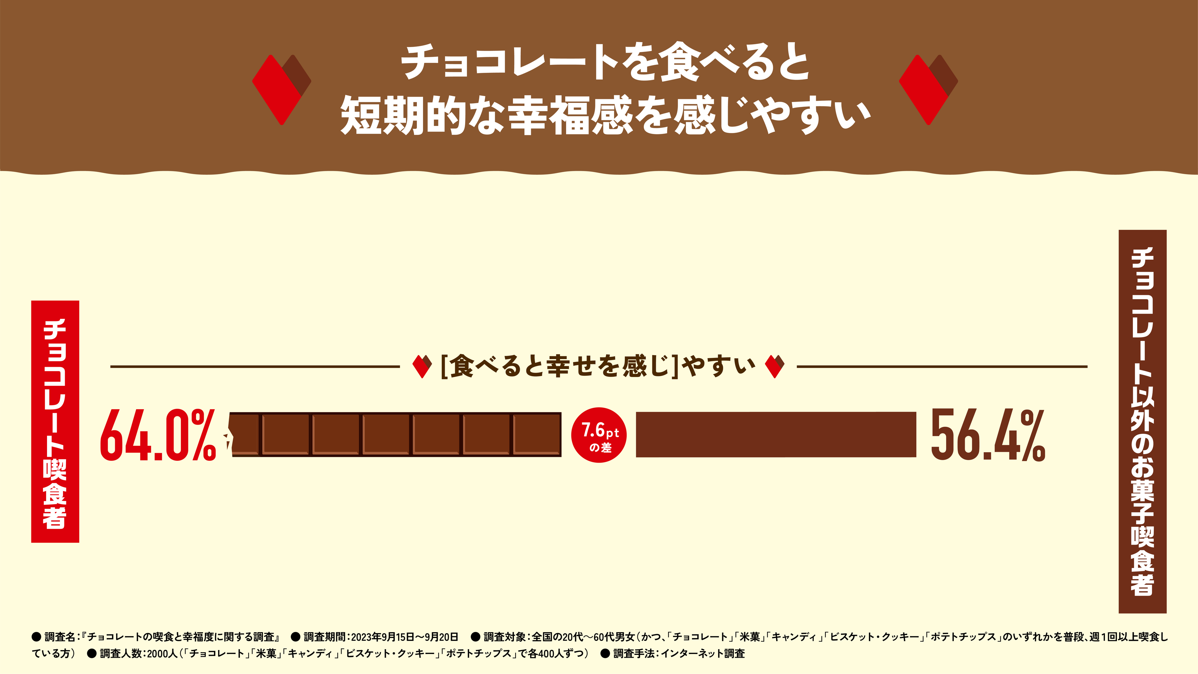 チョコレート喫食者の64%が「食べると幸せを感じる」と回答し、チョコレート以外のお菓子喫食者の平均よりも高いスコアに。喫食した時に短期的に得られる幸福感は、チョコレートが最も大きい結果になりました。