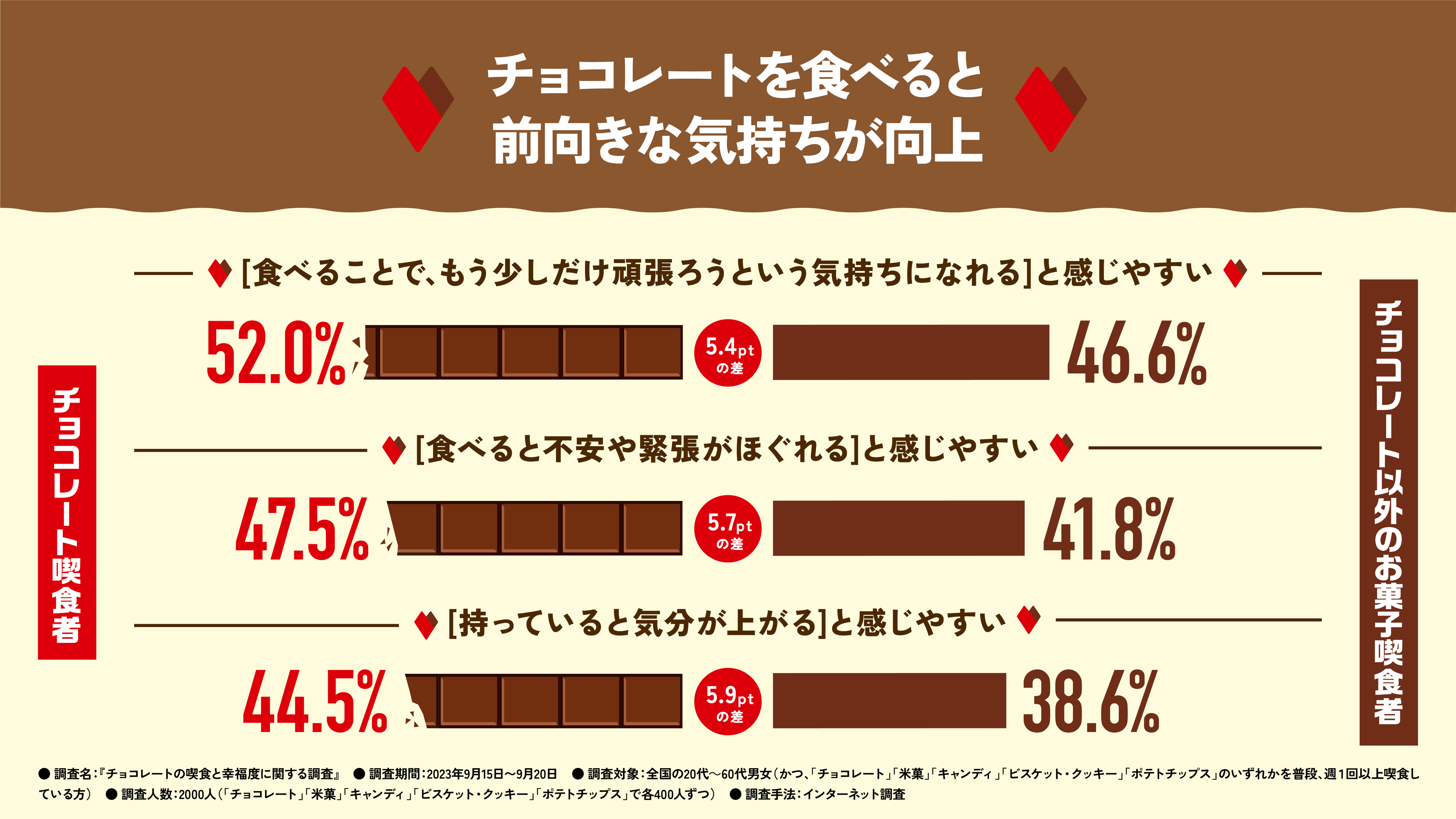 また、チョコレートを「食べることで、もう少しだけ頑張ろうという気持ちになれる」(52.0%)、「食べると不安や緊張がほぐれる」(47.5%)、「持っていると気分が上がる」(44.5%)など、チョコレートは食べるだけでなく存在自体が前向きな気持ちに寄与する可能性があると考えられます。