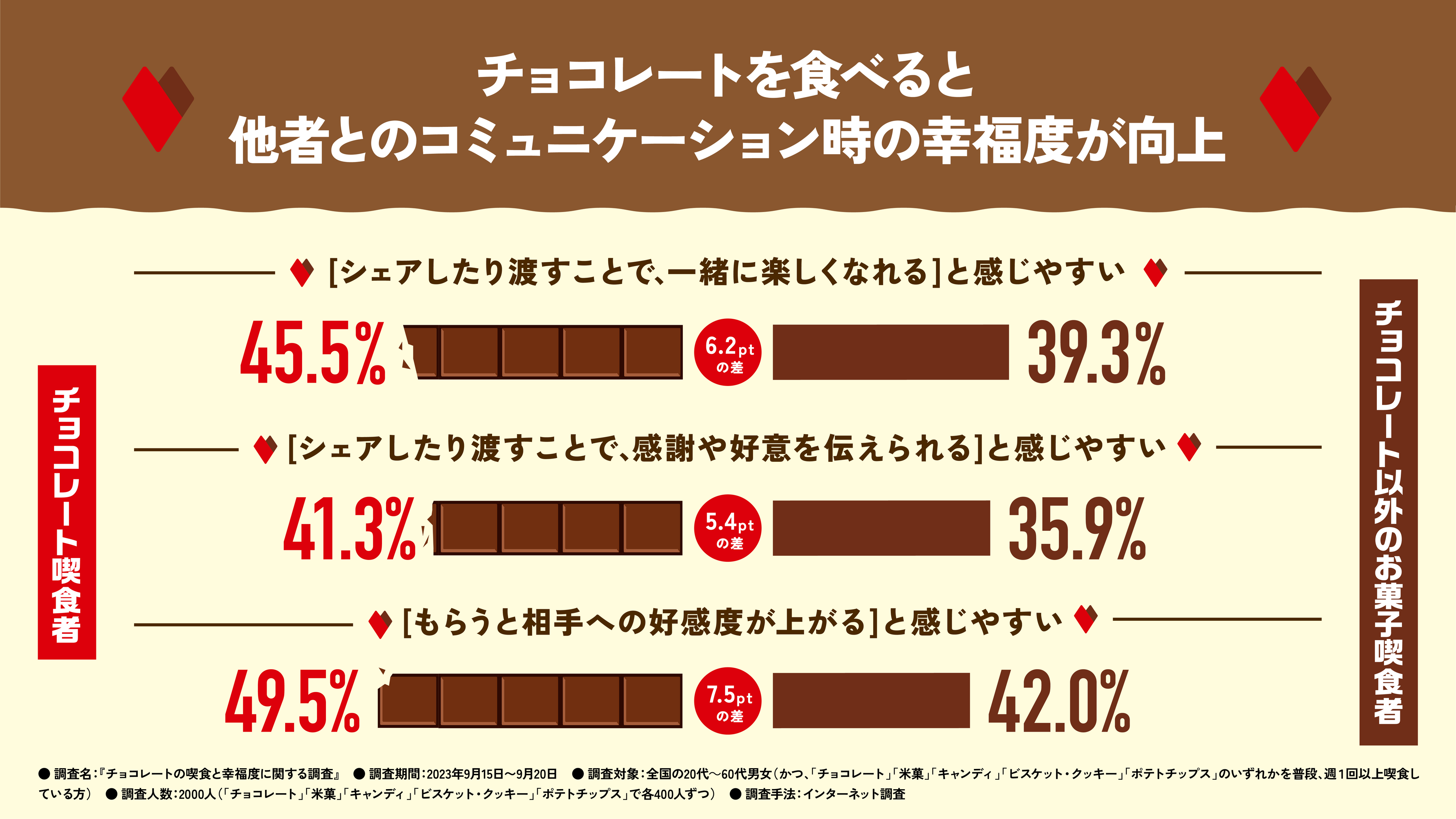 チョコレート喫食者の約2人に1人は「シェアしたり渡すことで、一緒に楽しくなれる」(45.5%)、 「もらうと相手への好感度が上がる」(49.5%)、4割近くが「シェアしたり渡すことで、感謝や好意を伝えられる」(41.3%)と回答し、チョコレート以外のお菓子喫食者と比べても高いスコアに。チョコレートが他者に渡したりもらったりする場面で幸福度向上に寄与している可能性が明らかになりました。