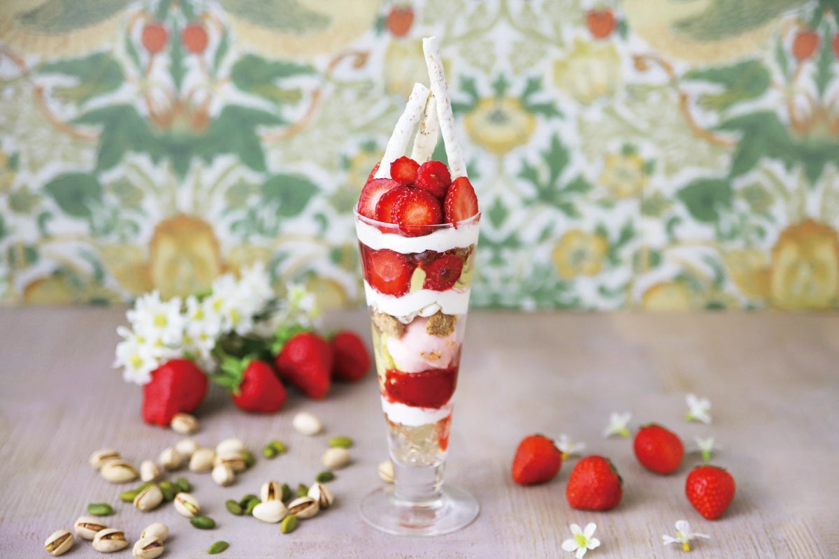 苺とグロゼイユで炊き上げた甘酸っぱいコンフィチュールに、ピスタチオクリームとヘーゼルナッツのクランブルを重ねました。さっぱりとしたエルダーフラワーのジュレの香りとフレッシュな苺が贅沢に散りばめられたパルフェです。