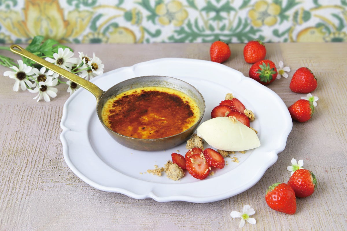 「パリッ」とキャラメルを割る瞬間の楽しさと自慢のクリームが人気のクレームブリュレに、苺を添えて。