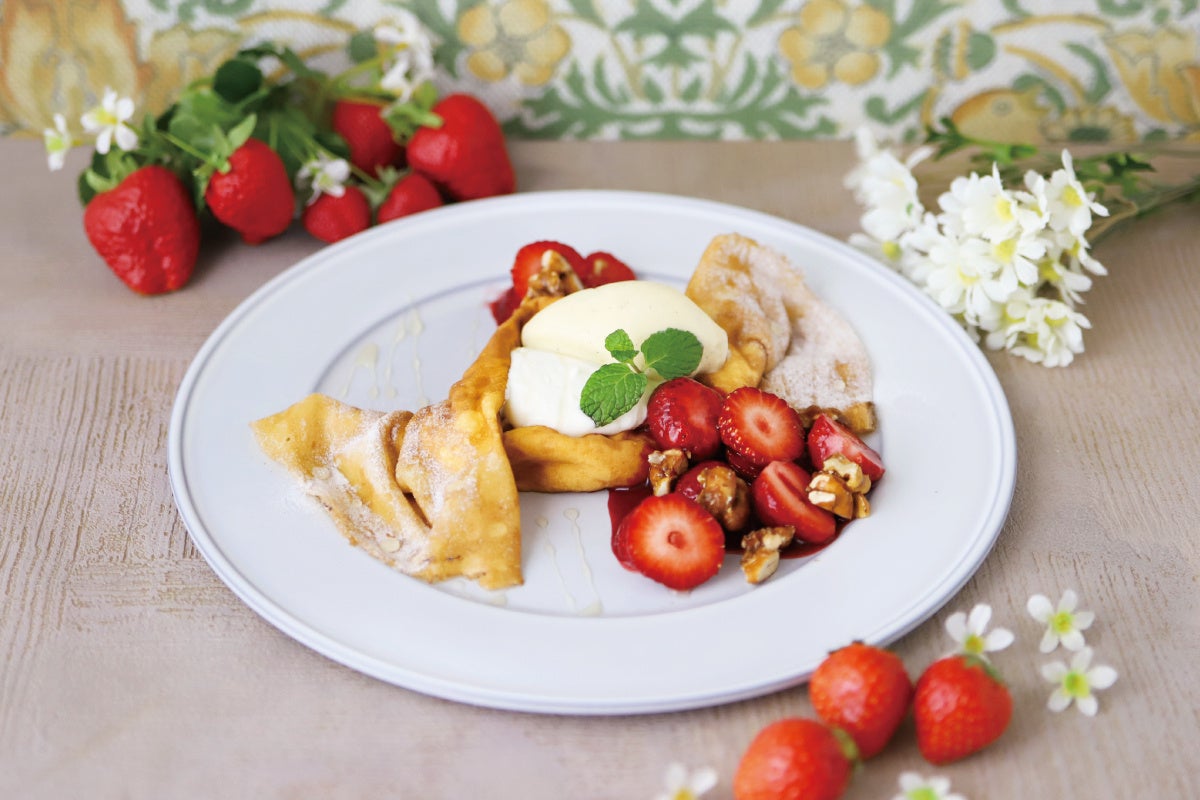 フレッシュな苺とキャラメリゼしたナッツを合わせた春限定クレープ。ふわふわのフロマージュブランとバニラアイスを一緒にお楽しみください。