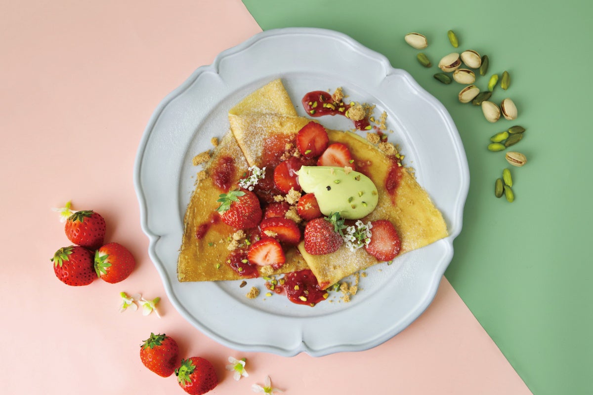 甘酸っぱい苺にピスタチオクリームを合わせたクレープ。自家製苺ソース、シナモンクランブルと一緒にお召し上がりください。